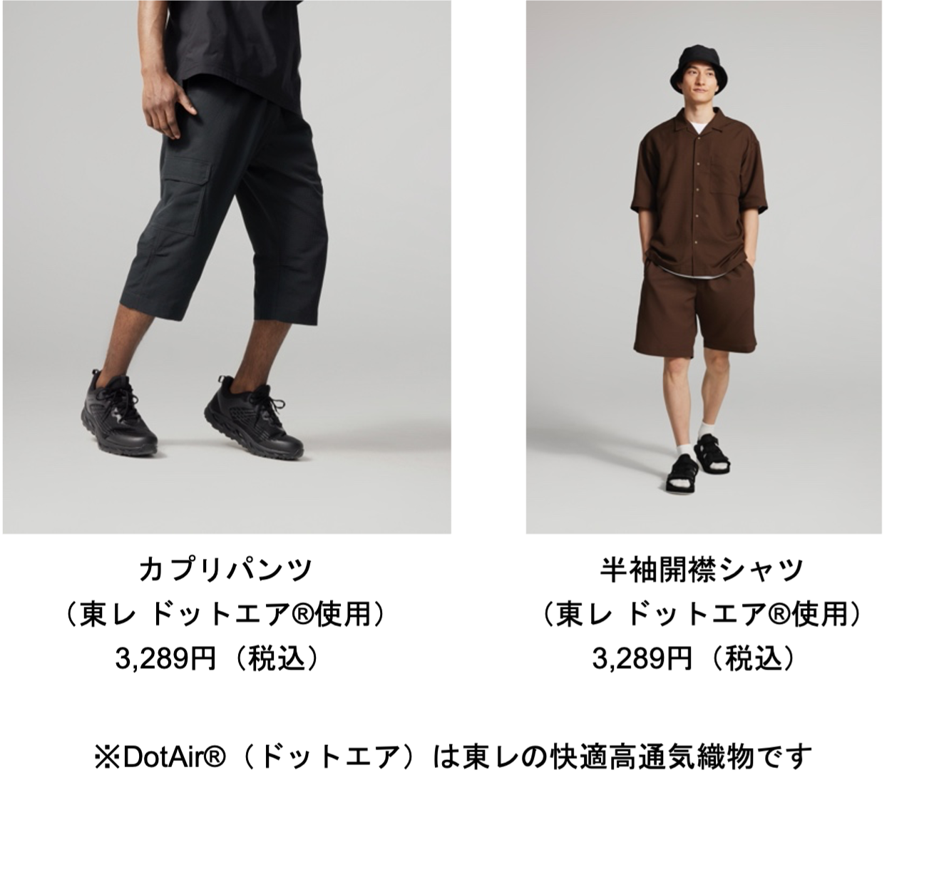 通気性・軽量性に優れた素材を使用した、「カプリパンツ(東レ ドットエア®使用)」と「半袖開襟シャツ(東レ ドットエア®使用) 」もそれぞれ25%値下げの3,289円(税込)で展開。無数の細かな穴が空いた生地「WIND+ by DotAir®」を使うことで、通気性に優れているほか、軽量で暑い季節にピッタリな商品となっております。「カプリパンツ」は、ゆったり履けるシルエットのほかカーゴポケット付きで、ワンマイルウエアとしても最適です。また、「半袖開襟シャツ 」は、リラックスシルエットながら上品なオープンカラーですっきりとした仕上がりになっており、ちょっとしたお出かけにも最適です。