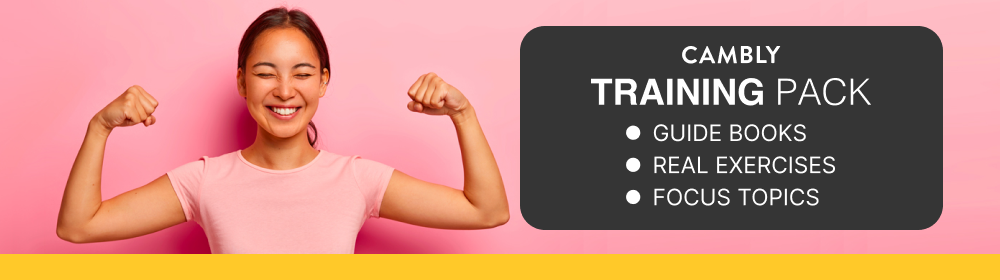 Training Packは、「Guide Books」「Real Exercises」「Focus Topics」の3ステップで構成されており、英語を流暢に話すためには欠かせない知識やテクニックを、Eブック、ネイティブ講師によるレッスン動画、エクササイズブックなどを通して学ぶことができます。特典へのアクセスは、Camblyへの新規登録後メールにてお送りします。