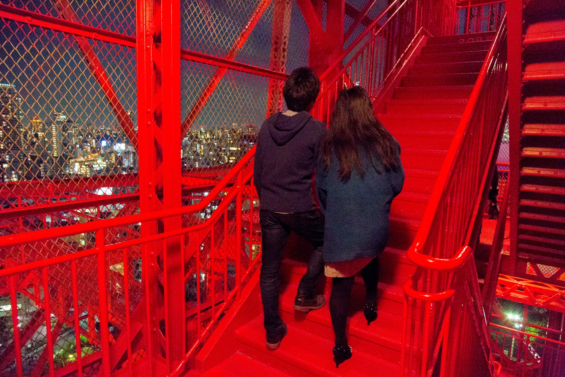 夜のオープンエア外階段コースの醍醐味はなんといっても、夜景を眺めつつ、ライトアップに浮かび上がる「鉄骨」の中を昇っていく感覚を味わえること。