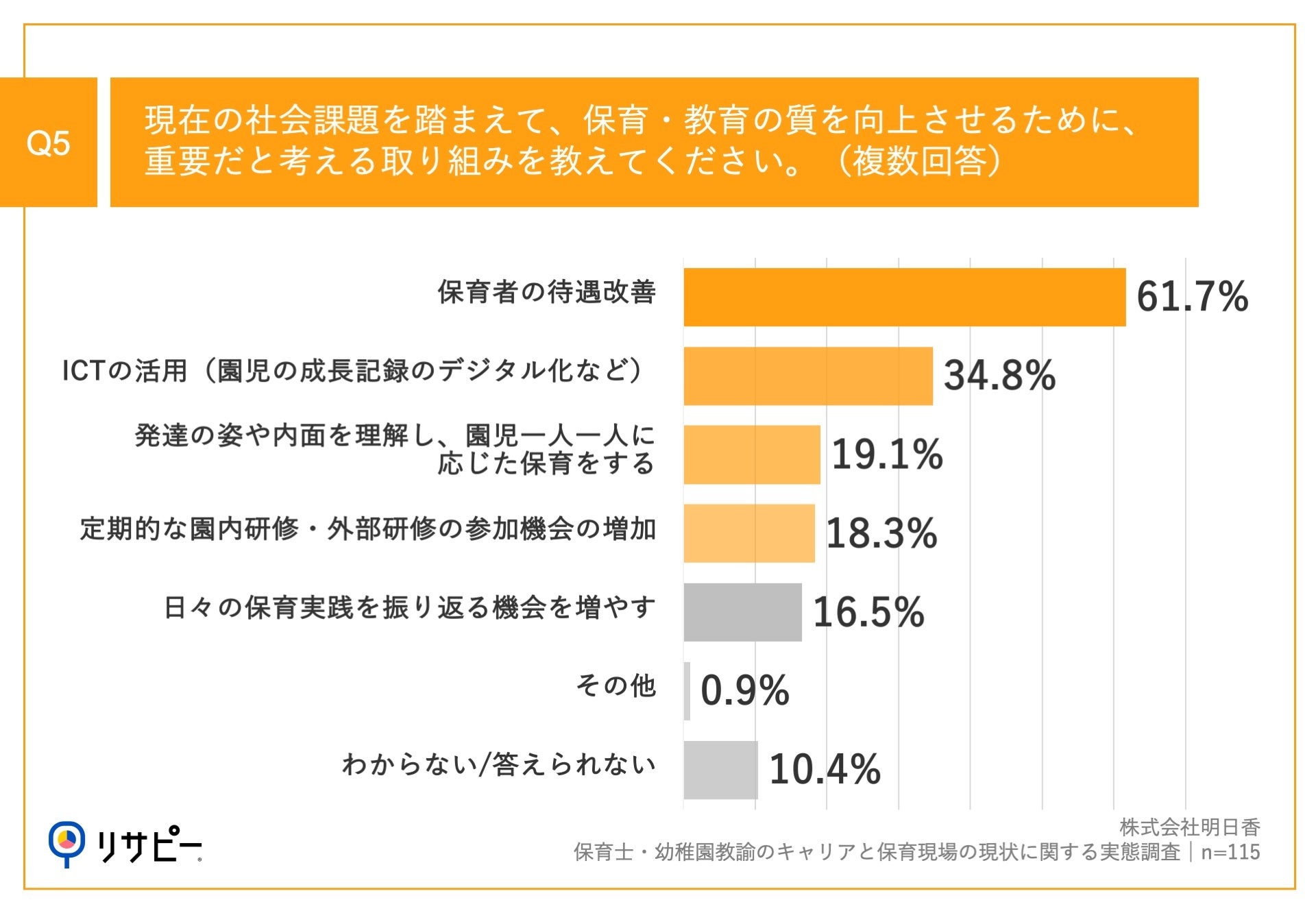 「Q5.現在の社会課題を踏まえて、保育・教育の質を向上させるために、重要だと考える取り組みを教えてください。(複数回答)」(n=115)と質問したところ、「保育者の待遇改善」が61.7%、「ICTの活用(園児の成長記録のデジタル化など)」が34.8%、「発達の姿や内面を理解し、園児一人一人に応じた保育をする」が19.1%という回答となりました。