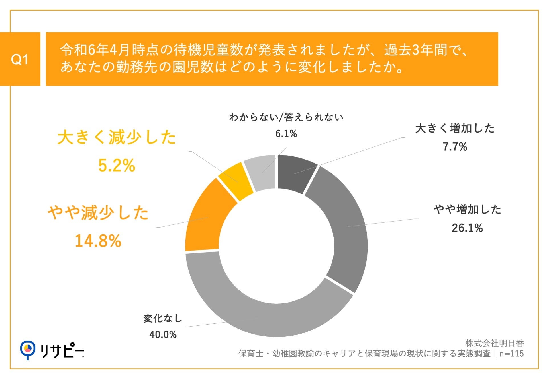 「Q1.令和6年4月時点の待機児童数が発表されましたが、過去3年間で、あなたの勤務先の園児数はどのように変化しましたか。」(n=115)と質問したところ、「やや減少した」が14.8%、「大きく減少した」が5.2%という回答となりました。
