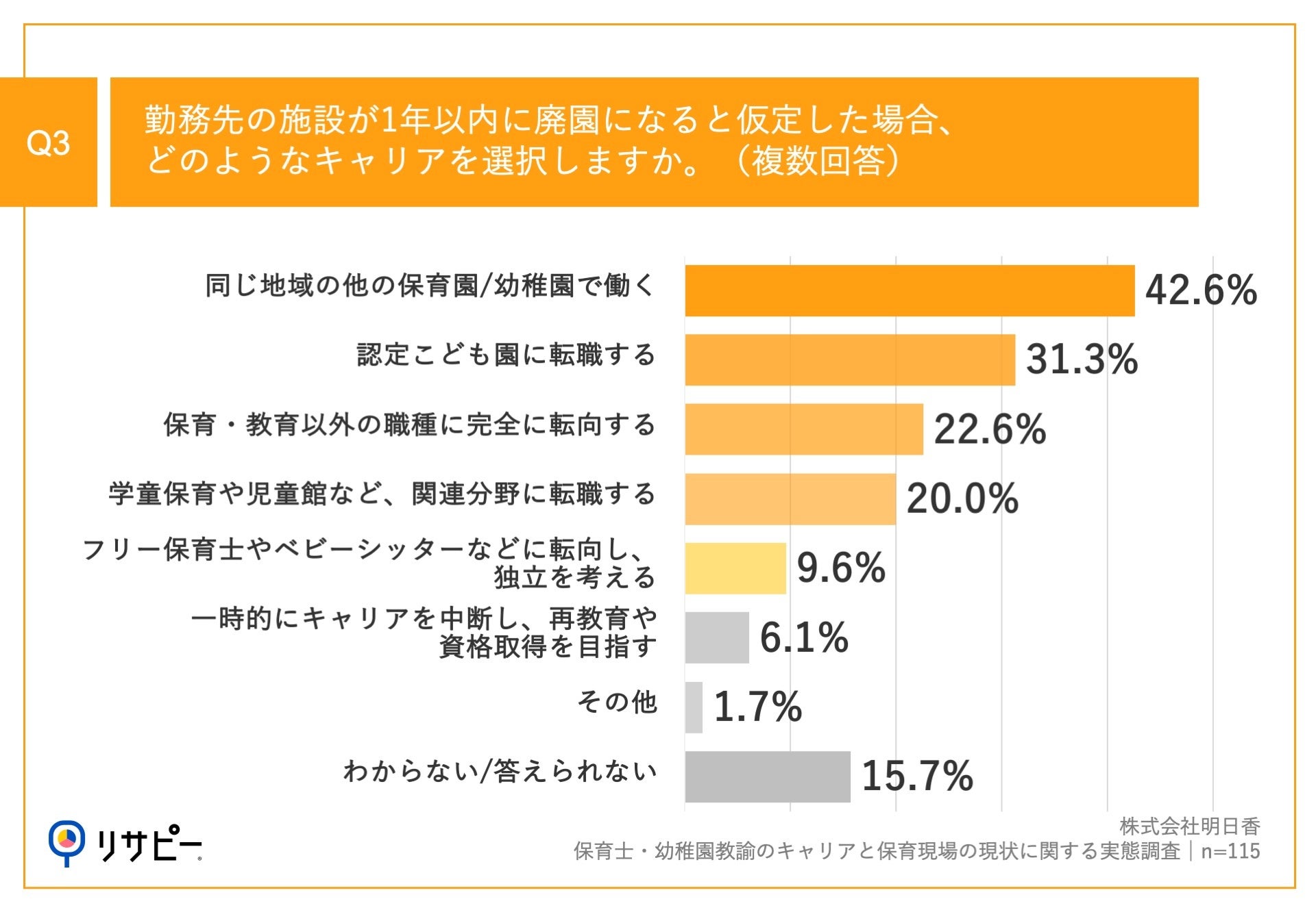 「Q3.勤務先の施設が1年以内に廃園になると仮定した場合、どのようなキャリアを選択しますか。(複数回答)」(n=115)と質問したところ、「同じ地域の他の保育園/幼稚園で働く」が42.6%、「認定こども園に転職する」が31.3%、「保育・教育以外の職種に完全に転向する」が22.6%という回答となりました。
