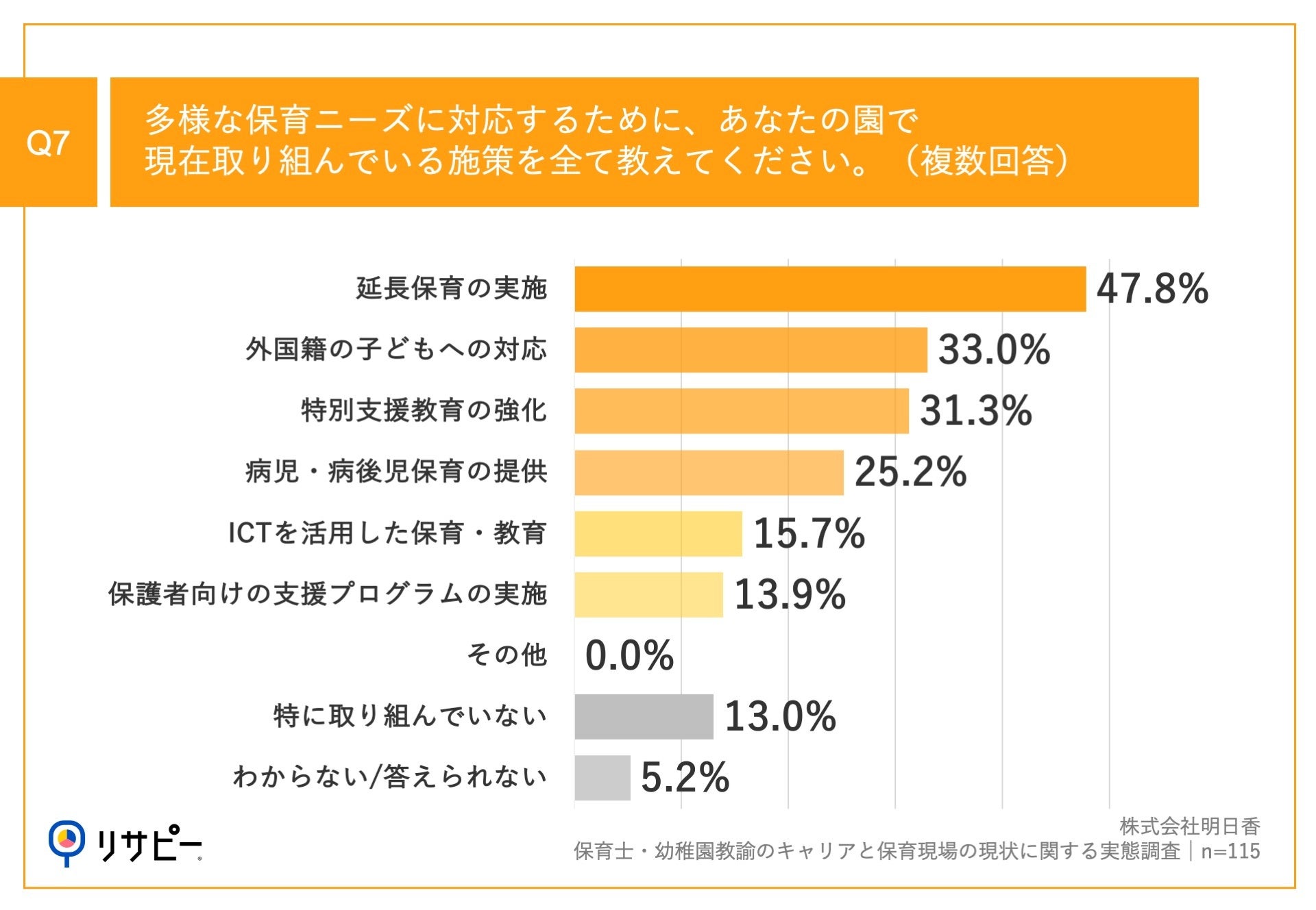 「Q7.多様な保育ニーズに対応するために、あなたの園で現在取り組んでいる施策を全て教えてください。(複数回答)」(n=115)と質問したところ、「延長保育の実施」が47.8%、「外国籍の子どもへの対応」が33.0%、「特別支援教育の強化」が31.3%という回答となりました。