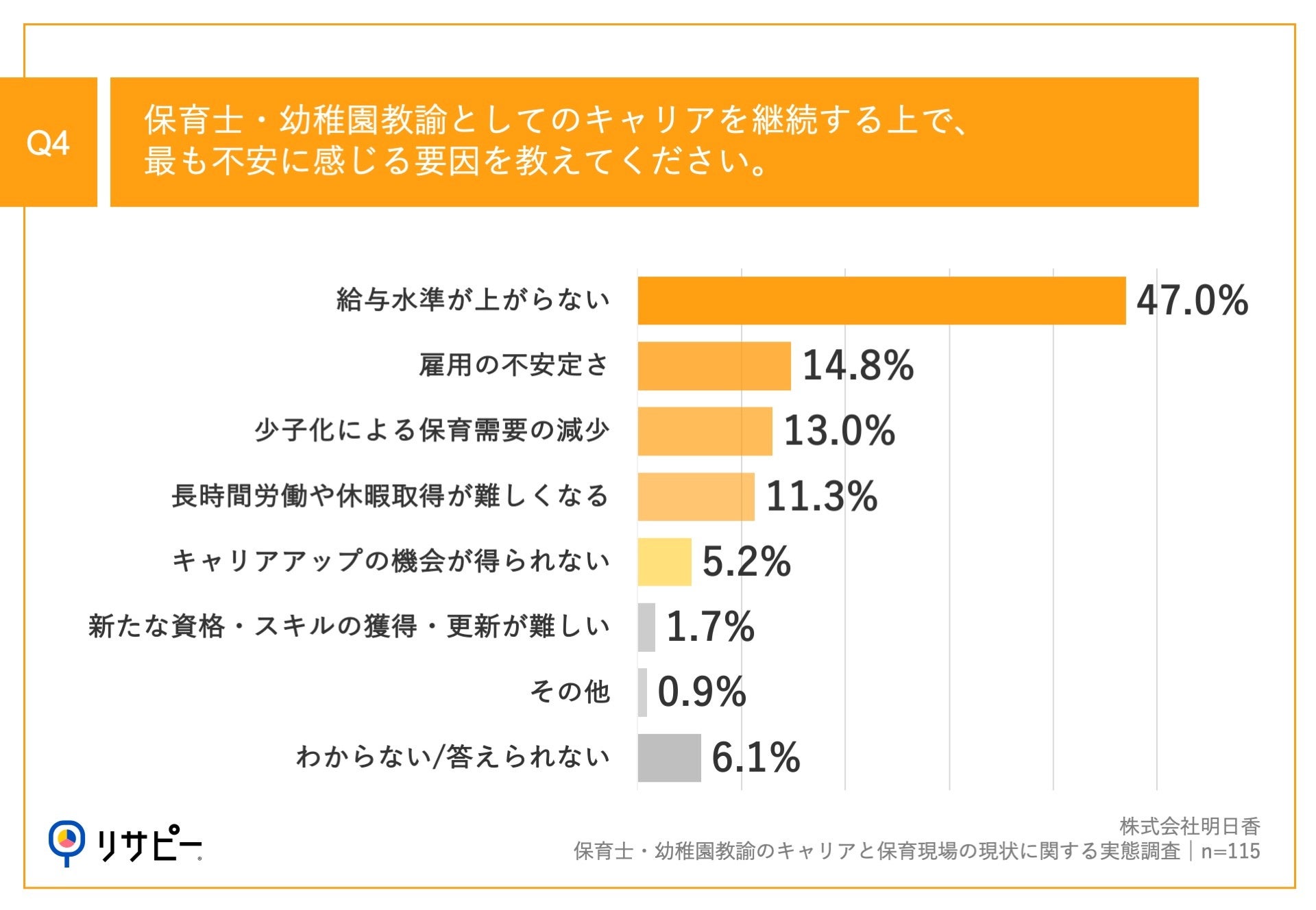 「Q4.保育士・幼稚園教諭としてのキャリアを継続する上で、最も不安に感じる要因を教えてください。」(n=115)と質問したところ、「給与水準が上がらない」が47.0%、「雇用の不安定さ」が14.8%、「少子化による保育需要の減少」が13.0%という回答となりました。