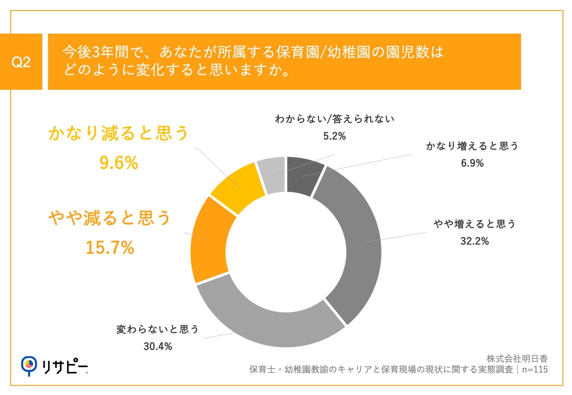 「Q2.今後3年間で、あなたが所属する保育園/幼稚園の園児数はどのように変化すると思いますか。」(n=115)と質問したところ、「やや減ると思う」が15.7%、「かなり減ると思う」が9.6%という回答となりました。
