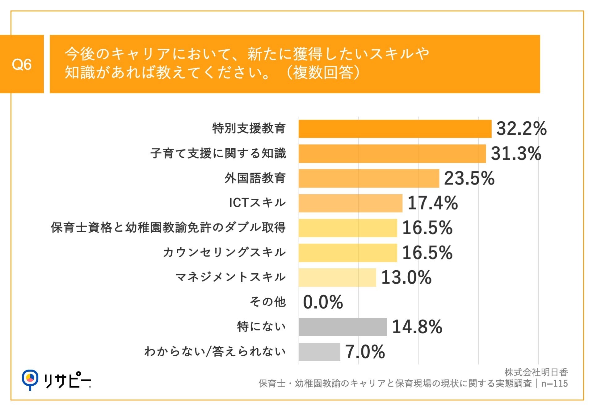 「Q6.今後のキャリアにおいて、新たに獲得したいスキルや知識があれば教えてください。(複数回答)」(n=115)と質問したところ、「特別支援教育」が32.2%、「子育て支援に関する知識」が