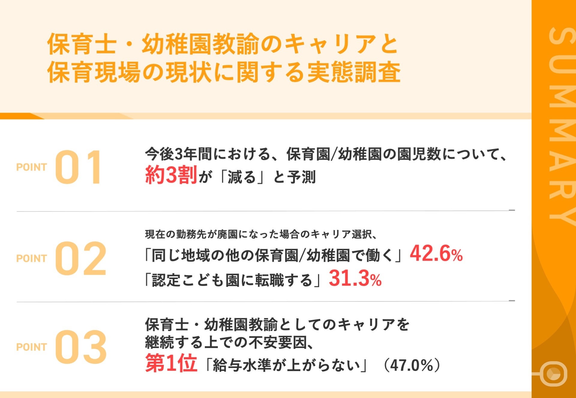 【名古屋保育士1200人「雇い止め」、保育者のキャリア不安を調査】保育者の約3割が、この先3年の園児減少を予測 保育士・幼稚園教諭のキャリア継続、最も不安に感じる要因が明らかに