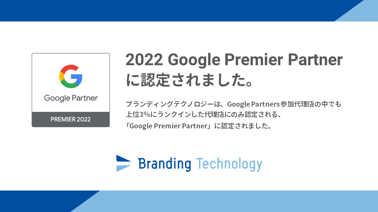 ブランディングテクノロジー株式会社(代表取締役社長:木村 裕紀、本社:東京都渋谷区、証券コード7067、以下当社)は、Google Partners プログラムの 2022 Premier Partner に認定されましたことをご報告いたします。