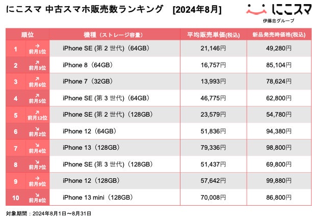 2024年8月の販売数ランキングでは、iPhone SE(第2世代)が9ヶ月連続で1位にランクインしました。