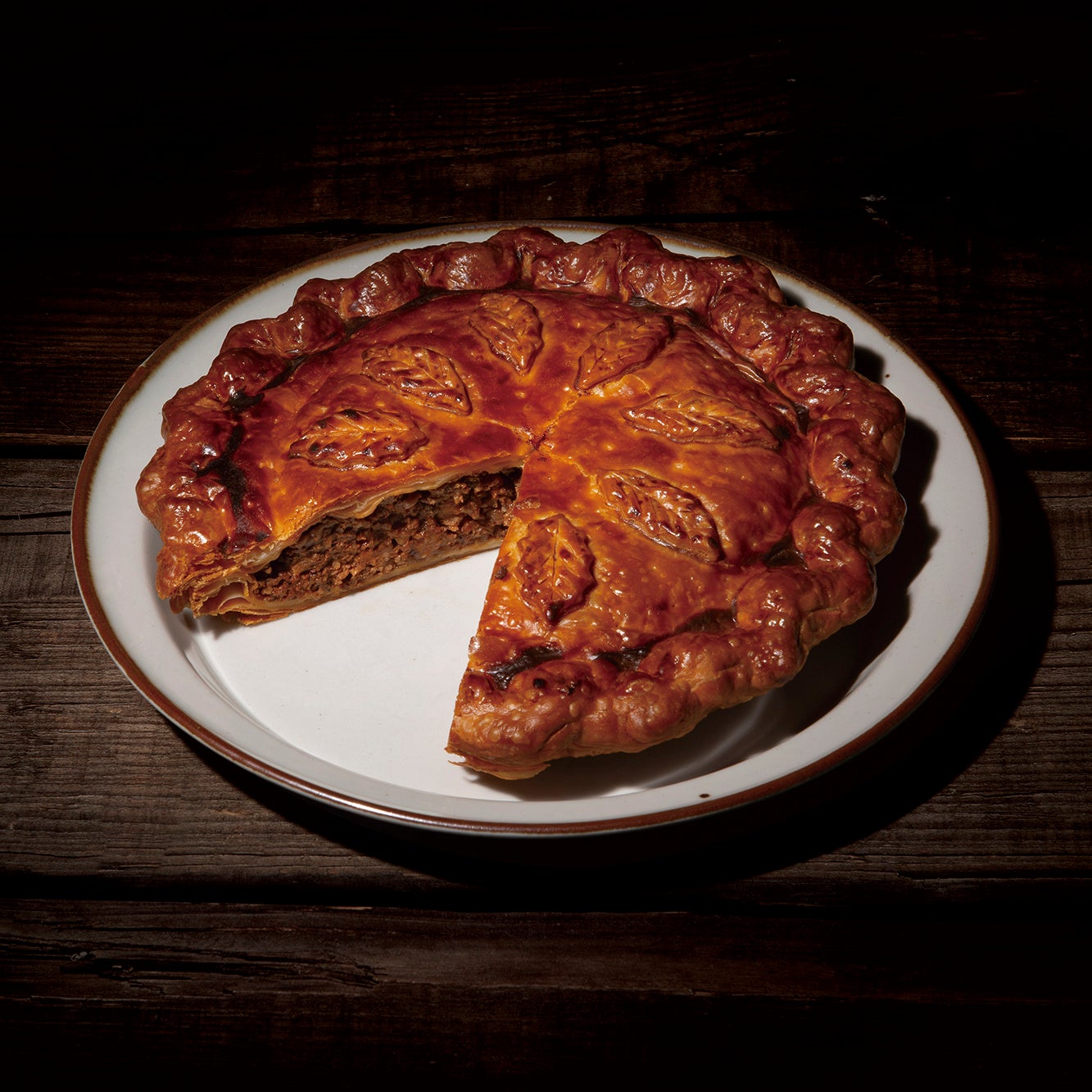 フィリングが詰まった自家製のミートパイは冬の間しか食べられない毎年人気の一品です。