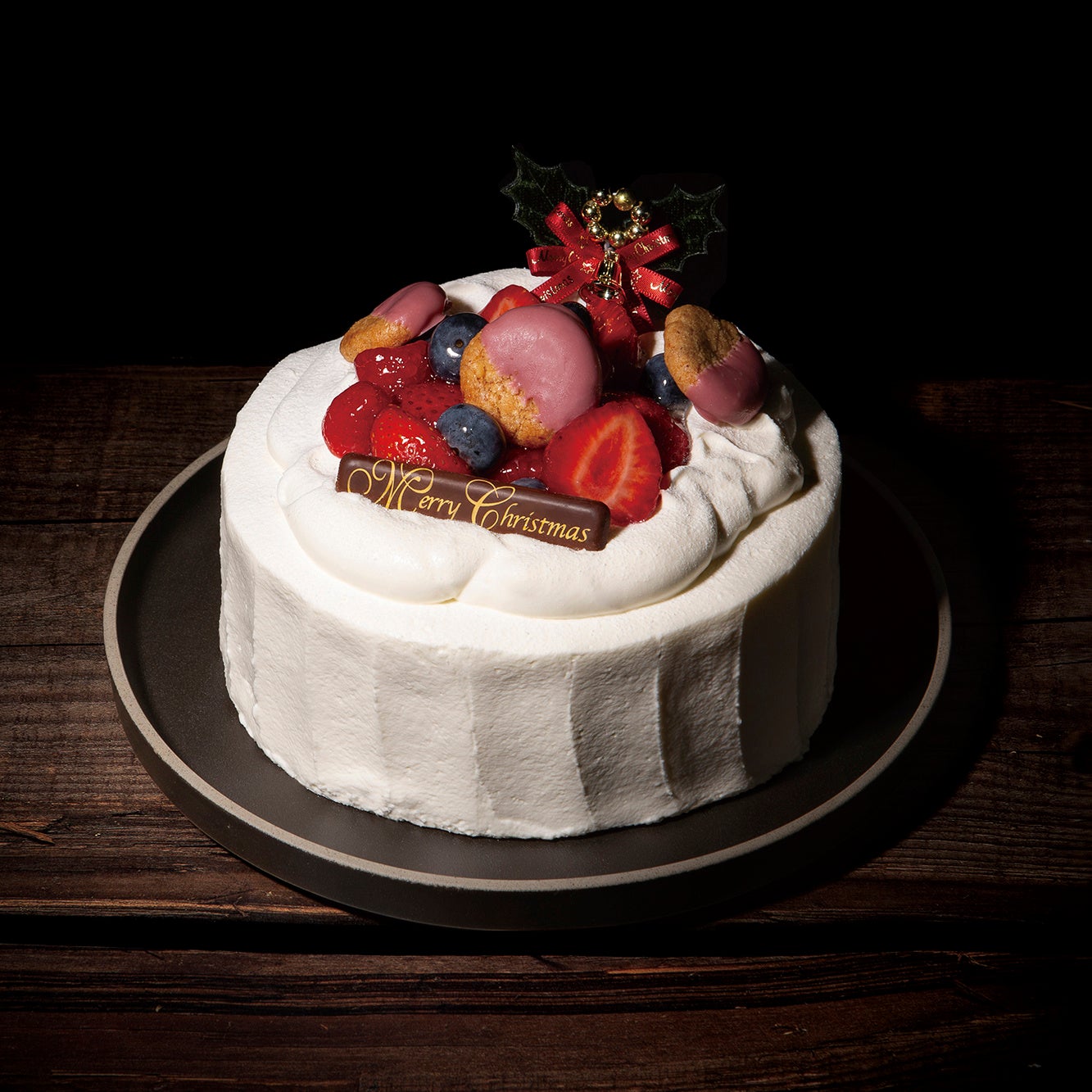 王道のショートケーキがご予約限定で登場!ストロベリー、ラズベリー、ブルーベリーの3種のベリーとピンクのチョコがけクッキーがクリスマスの食卓を華やかに彩ります。