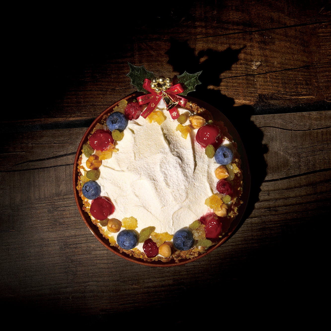 ジューシーで甘酸っぱい味わいが人気の「レモンパイ」をクリスマスリースに見立て、キュートにアレンジ。トップはメレンゲではなくクリームチーズベースのクリームにしてこの時期らしく濃厚に仕上げました。