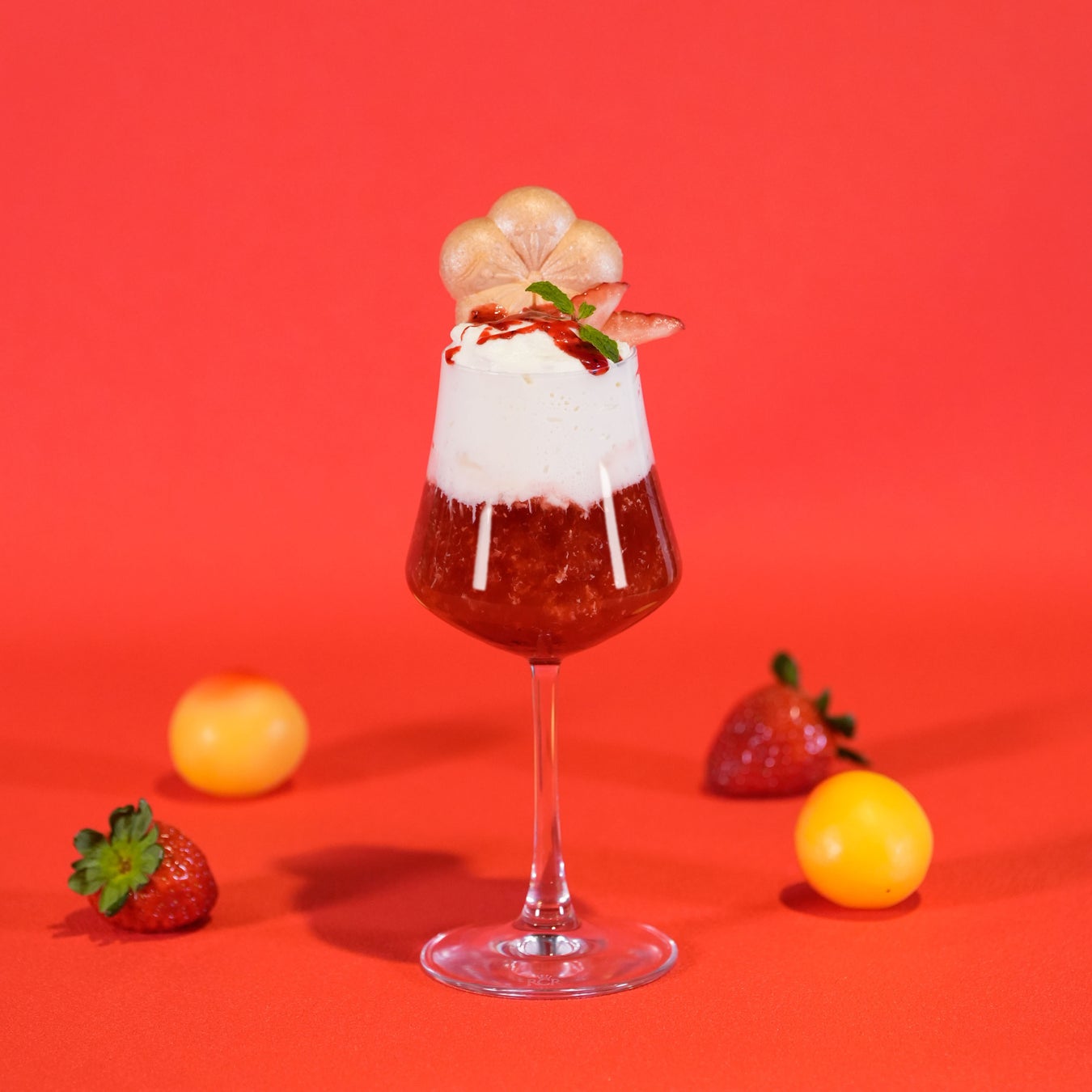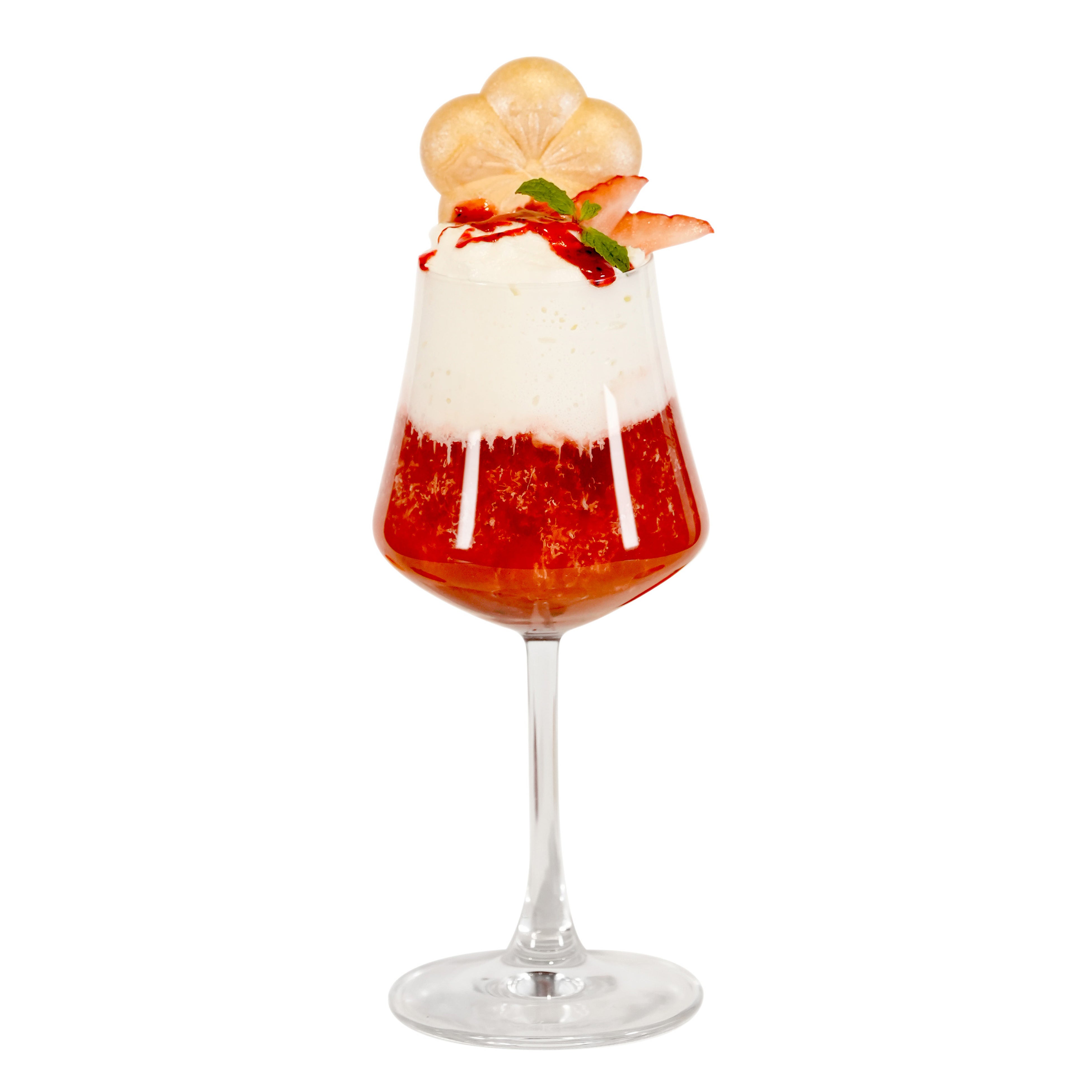 苺のショートケーキから着想したホット梅酒カクテル「梅いちごショートケーキフロート」は、紅茶と苺をブレンドしたホット梅酒に、ビスケット生地を包んだ梅ミルクのクリーム層を重ね、濃密な苺シロップとフレッシュな苺と梅最中を添えました。品良い甘さと香り、すっきりとした後口のホッとほぐれるカクテルです。