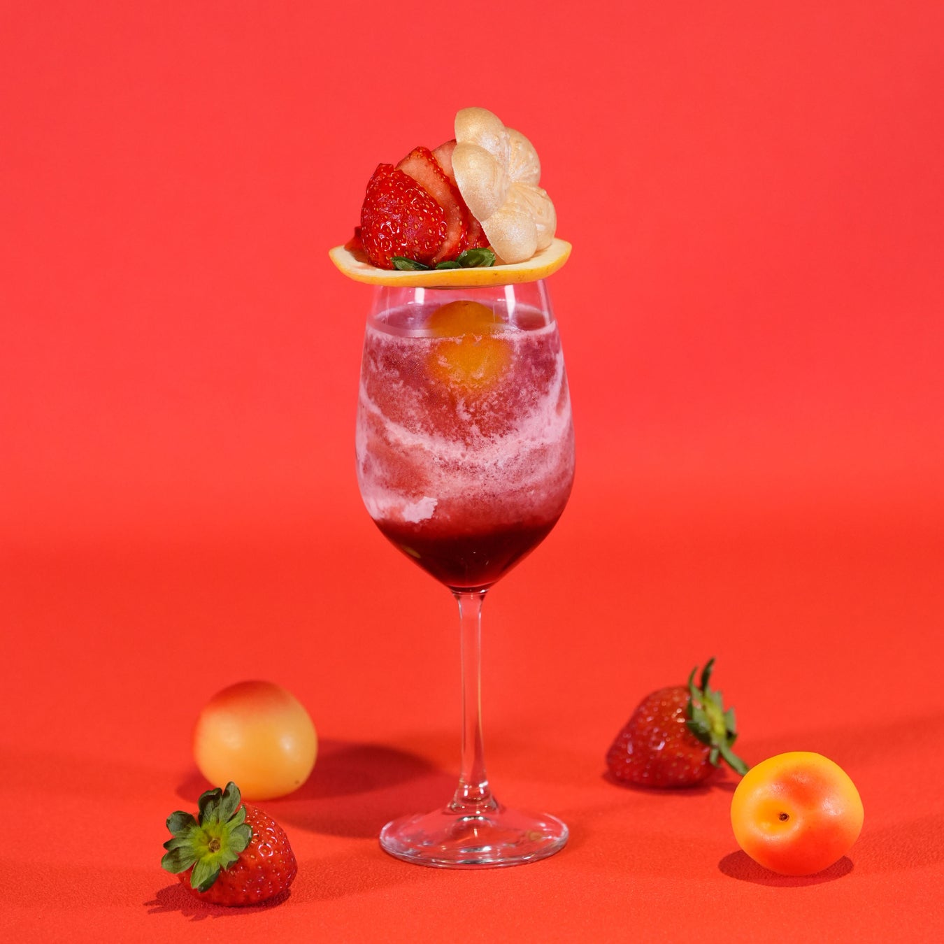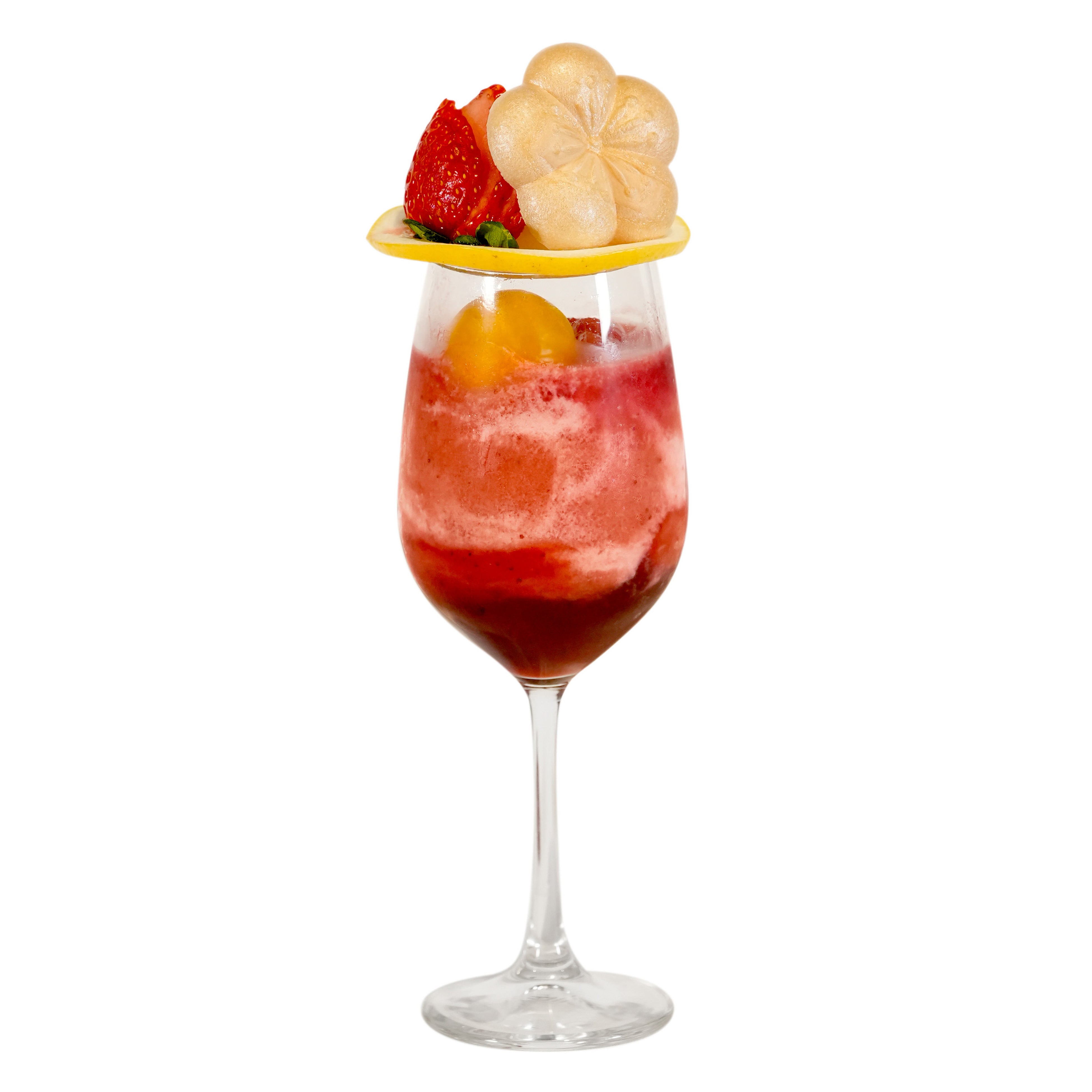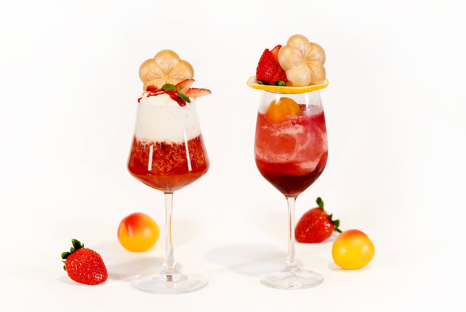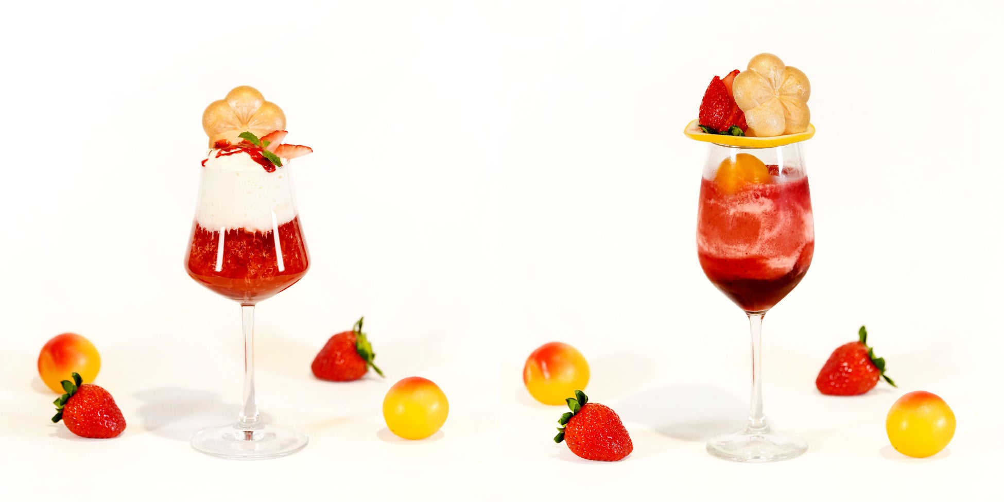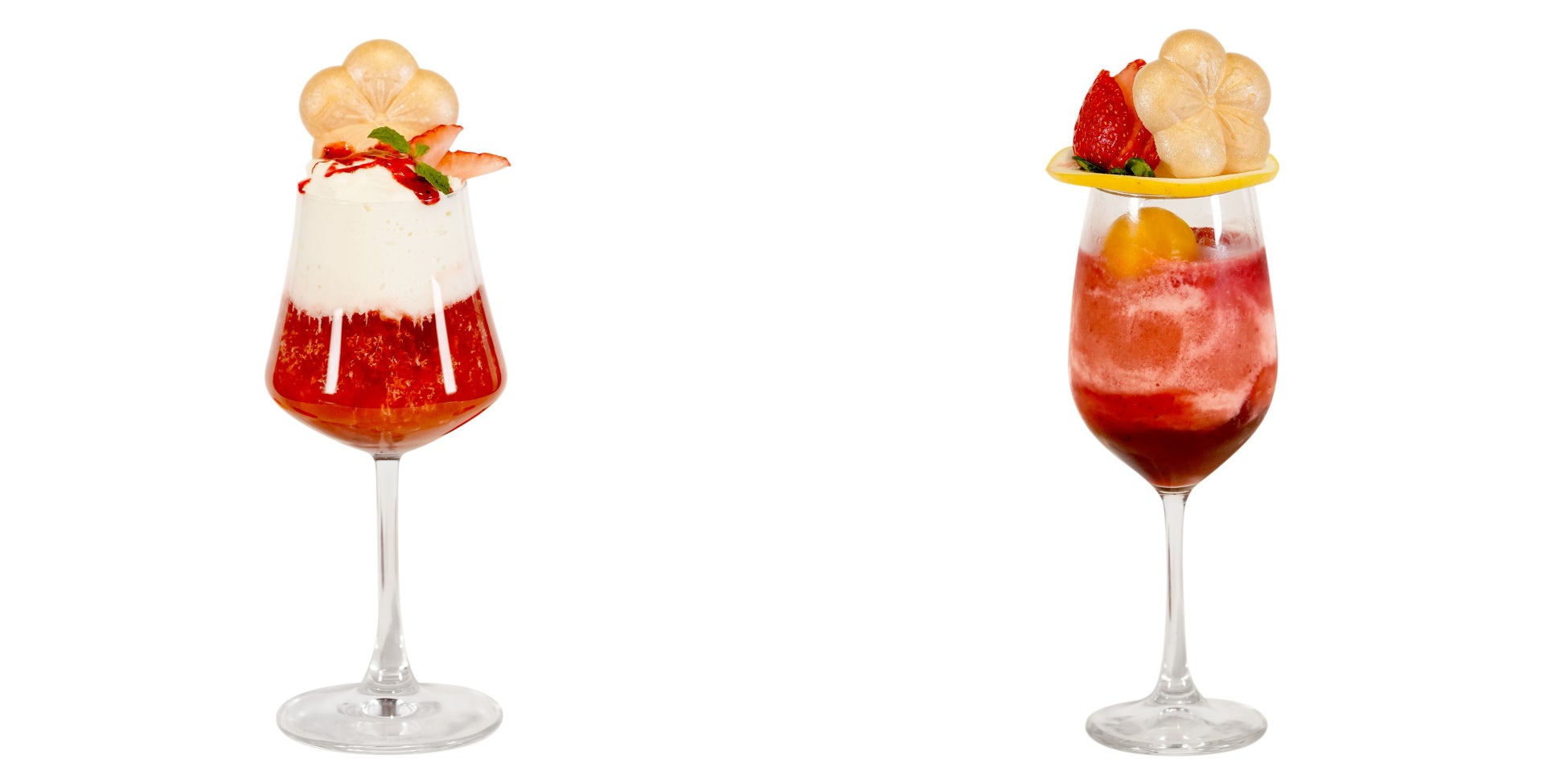 いちごミルクから着想した梅酒カクテルクリームソーダ「梅いちごミルクのクリームソーダ」は、完熟南高梅と濃厚苺のシロップの層に梅苺スムージーと牛乳が織り成すマーブル調の層を重ね、フローズン完熟南高梅を1粒浮かべました。グラスの上には、スライスしたグレープフルーツ、苺ソースがけバニラアイスに、フレッシュな苺と梅最中を添えました。濃厚な果実感のリッチな味わいのカクテルです。新作カクテル2品は、アルコール入りの酔うタイプとノンアルコールの酔わないタイプからお選びいただけます。