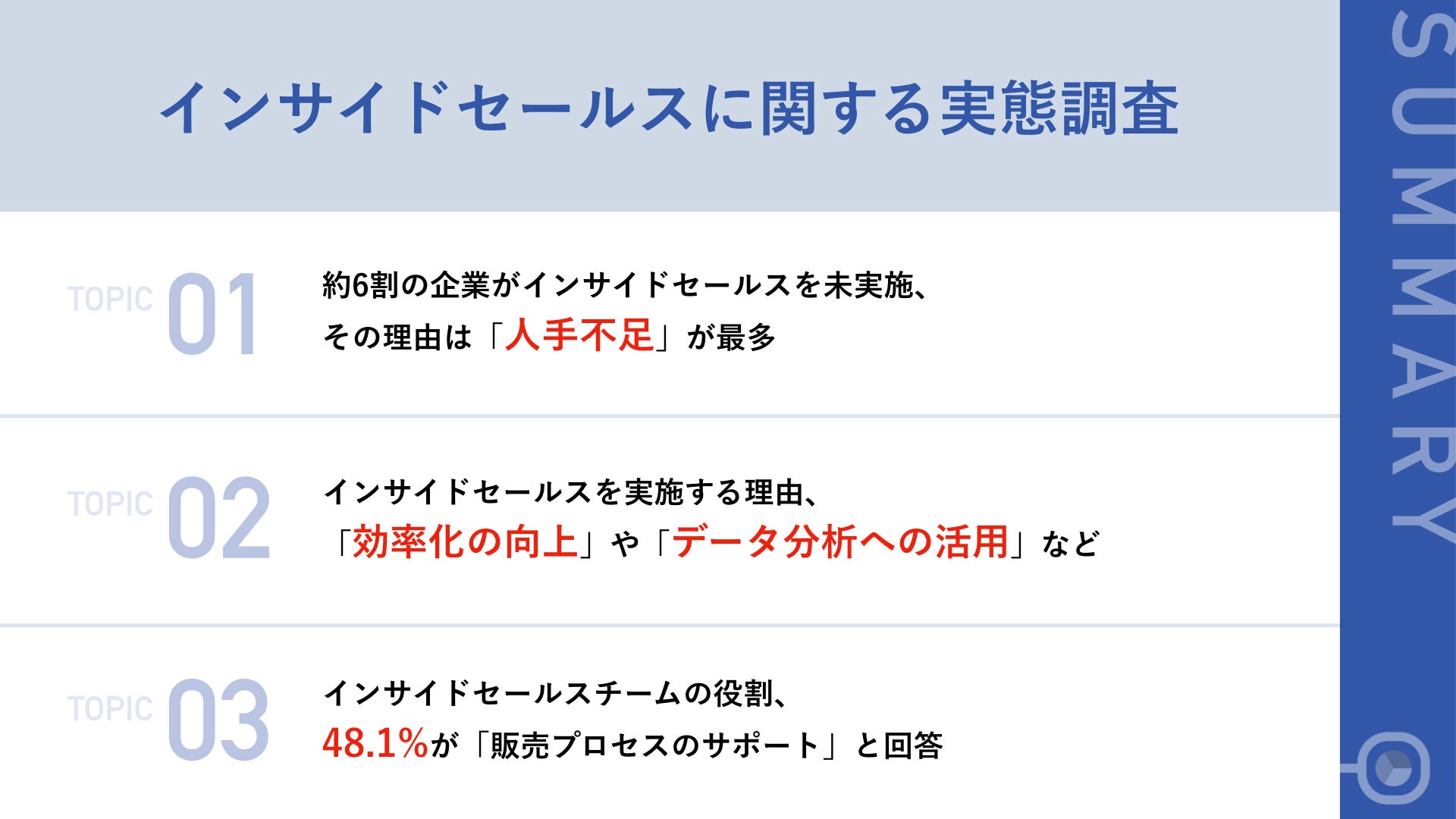 この調査では、ベンチャー企業でインサイドセールスを実施している企業は限られている一方で、実施している企業が予算も人員も限られている中で、少数精鋭のチームを編成し、リード獲得に向けて奮闘する姿が伝わってくる内容となりました。ベンチャー企業の営業活動において、効果的なインサイドセールスを展開することが重要な鍵になっていると言えるのではないでしょうか。