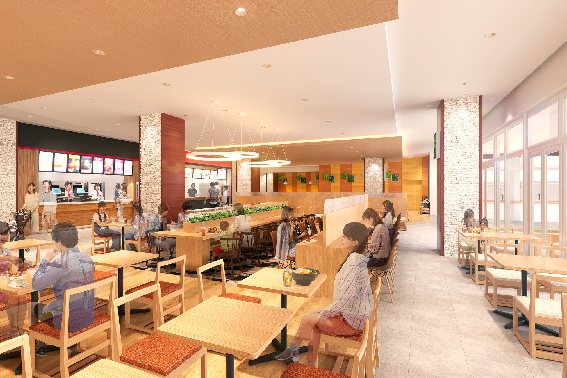 フードコート<テラスキッチン>は、「誰もが思い思いに」をコンセプトに、1人用席の増設や荷物置き・荷物フックの導入など、家具を見直し、より心地よい集いの場へとリニューアルします