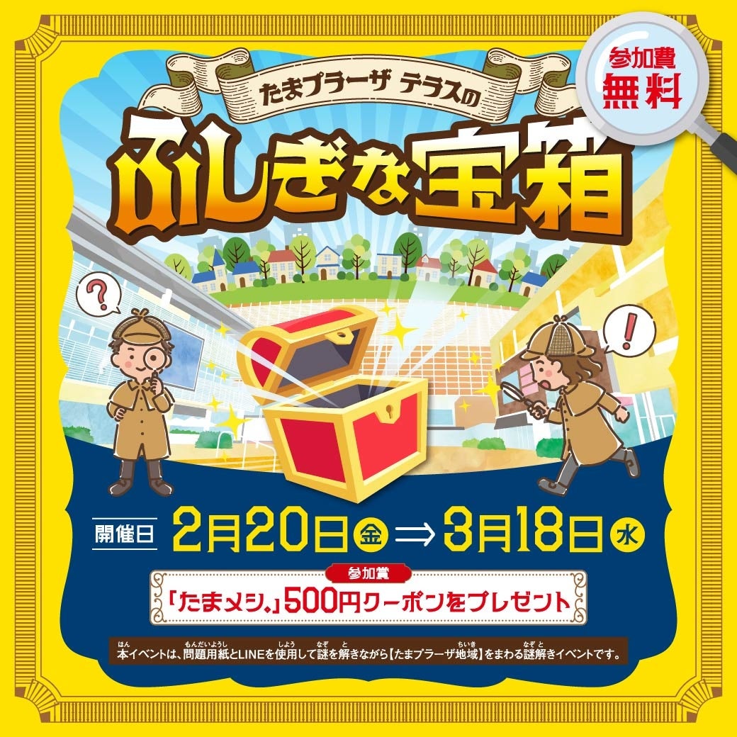 問題用紙とLINEアプリを使用して、謎を解きながらたまプラーザ テラス館内やたまプラーザ地域に設置されたスポットをまわる謎解きイベントです。参加いただいた方には、モバイルオーダーサービス「たまメシ。」で使える500円OFFクーポンをプレゼントします