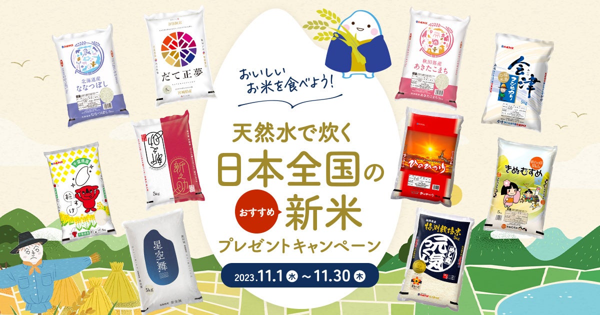 本キャンペーンでは、キャンペーン期間中に簡単なアンケートにお答えいただいた方の中から、抽選で50名様に全農パールライス様ご提供、日本全国のおすすめ新米(1袋5kg)と全農パールライス公式キャラクター「こめつぶ丸」のオリジナルグッズをプレゼントいたします。