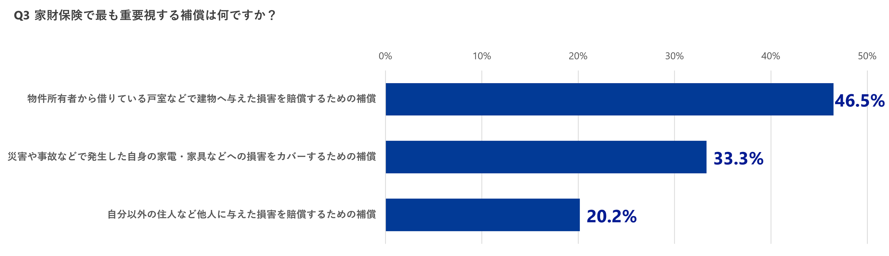 家財保険で最も重要視する補償を伺ったところ「物件所有者から借りている戸室などで建物へ与えた損害を賠償するための補償」と答えた方が最多で46.5%、続いて「災害や事故などで発生した自身の家電・家具などへの損害をカバーするための補償」と答えた方は33.3%、「自分以外の住人など他人に与えた損害を賠償するための補償」と答えた方が20.2%となりました。