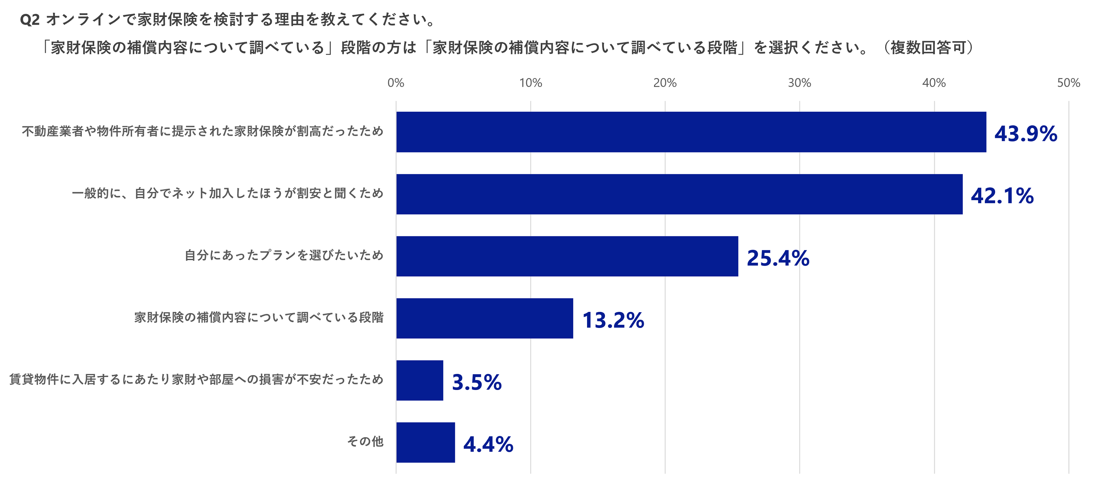 2. オンラインで家財保険を検討する理由は「不動産業者や物件所有者に提示された家財保険が割高だったた