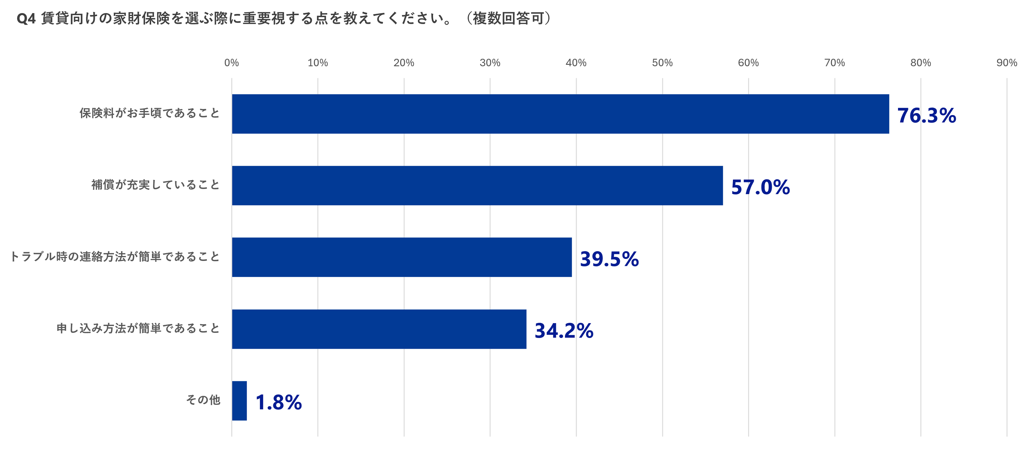 賃貸向けの家財保険を選ぶ際に重要視する点は「保険料がお手頃であること」が最も多く76.3%。次いで「補償が充実していること」が57.0%、「トラブル時の連絡方法が簡単であること」が39.5%となりました。