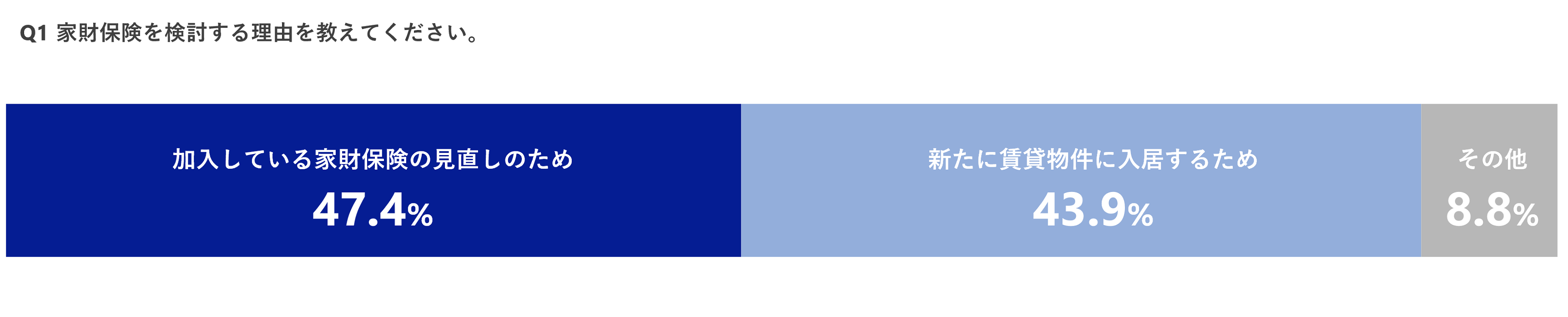 1. 家財保険を検討する理由は「加入している家財保険の見直しのため」が最多で47.4%。