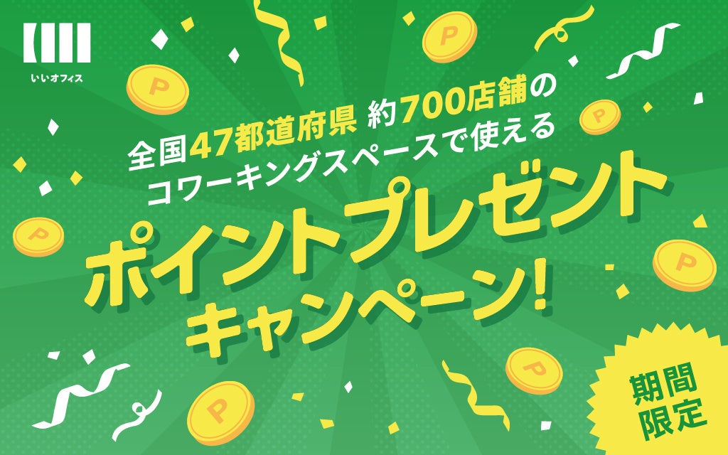 全国47都道府県に約700店舗のコワーキングスペースを展開する株式会社いいオフィス(本社:東京都港区、代表取締役:龍﨑 宏 以下、「いいオフィス」)は、新しい働き方の普及・推進を目的に、コワーキングスペースで利用可能なポイントプレゼントキャンペーンを実施いたします。