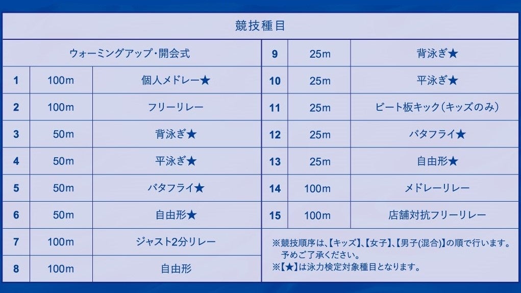 スイムフェスタでは各種競技に参加するだけでなく、同時に泳力検定を受けていただくことも可能です。泳力検定制度は、公益財団法人日本水泳連盟が創設した公認資格であり、履歴書等に記載することができます。スイムフェスタの出場種目の結果タイムが、受験する級の基準タイムを満たすことで認定されます。
