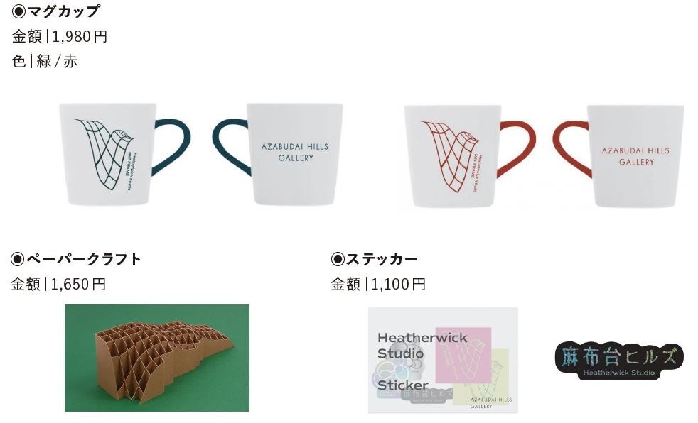 麻布台ヒルズの特徴的な建造物である、麻布台ヒルズアリーナの大屋根The Cloudや、ガーデンプラザの外観Net Frameは、イギリスのヘザウィック・スタジオによってデザインされました。THE SHOPでは、麻布台ヒルズの開業記念として、これらのデザインをかたどったマグカップ、ペーパークラフト、Tシャツのほか、トーマス・ヘザウィック氏本人が直筆で描いた「麻布台ヒルズ」の日本語文字ステッカー付きのステッカーセットも用意しました。