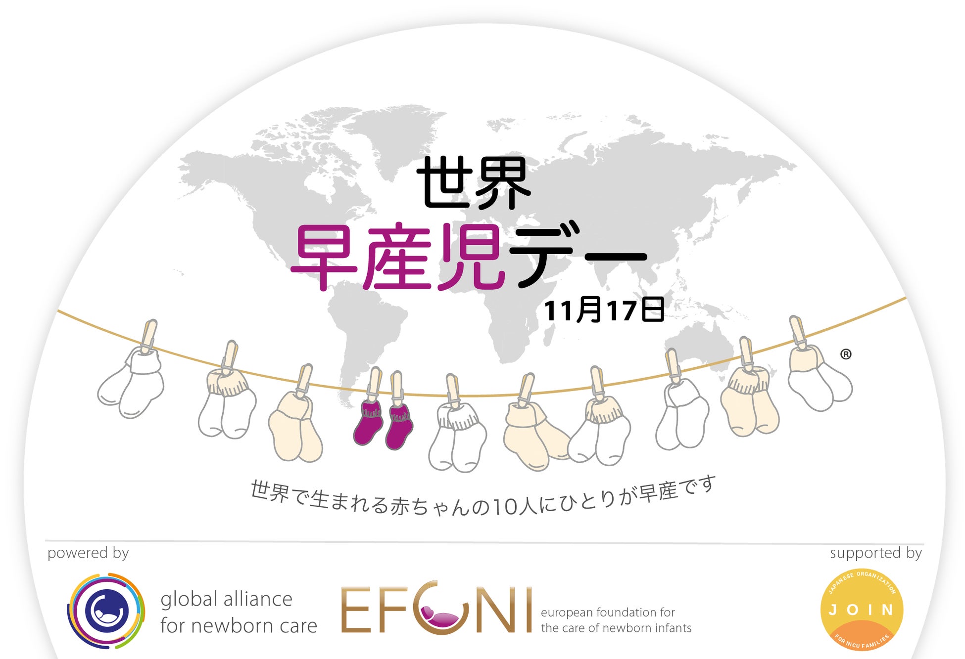 11月17日の世界早産児デーは、早く生まれた赤ちゃんとご家族が抱える課題や負担に対する意識を高めるために、2008年にヨーロッパNICU家族会(EFCNI)および提携している家族会によって制定された記念日です。靴下が並ぶイラストは、世界早産児デーのシンボル。9足の靴下の間にある1足の紫色の小さな靴下は、世界中で10人に1人の赤ちゃんが早産で生まれていることを象徴しています。