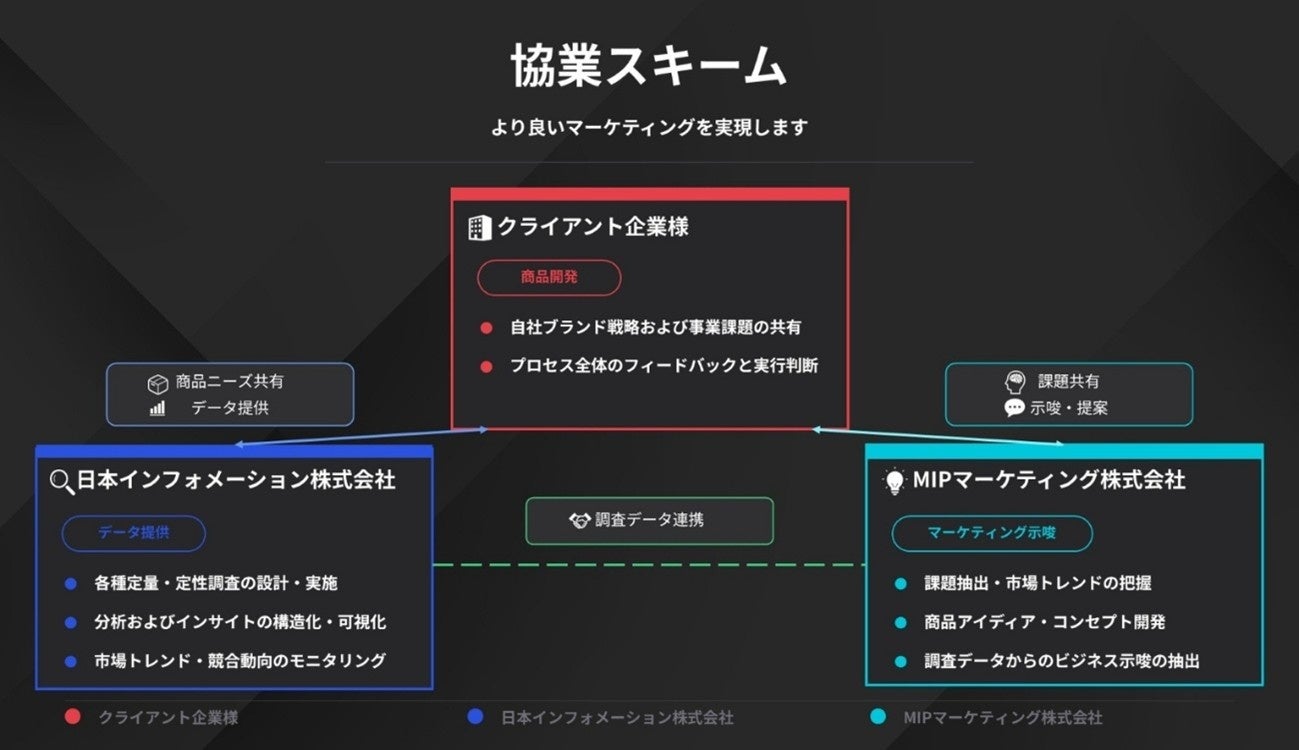 日本インフォメーション株式会社(本社:東京都中央区、代表取締役社長:斎藤啓太 以下、日本インフォメーション)は、MIPマーケティング株式会社(本社:神奈川県藤沢市、代表取締役:今村隆之 以下、MIPマーケティング)と、調査とマーケティング支援を一気通貫で提供する新たな協業の取り組みを開始しました。