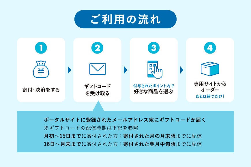 「神戸市あとから選べるWEBカタログギフト」は、寄付額に応じてポイントが付与され、ポイント内でお好みの返礼品を選んでいただけます。寄付を先に行って後からお好きなタイミングで返礼品を選べるので、先に寄付を済ませてゆっくり商品を選びたい時やちょっとしたギフトを送りたい時にもご活用いただけます。