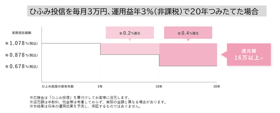 応援金還元率は受益権口数に係る資産残高に対して、商品別に応じて変動いたします。応援金は、新たに投資信託を買付ける資金に充当いたします(原則として、現金のまま、お渡しすることはありません)。