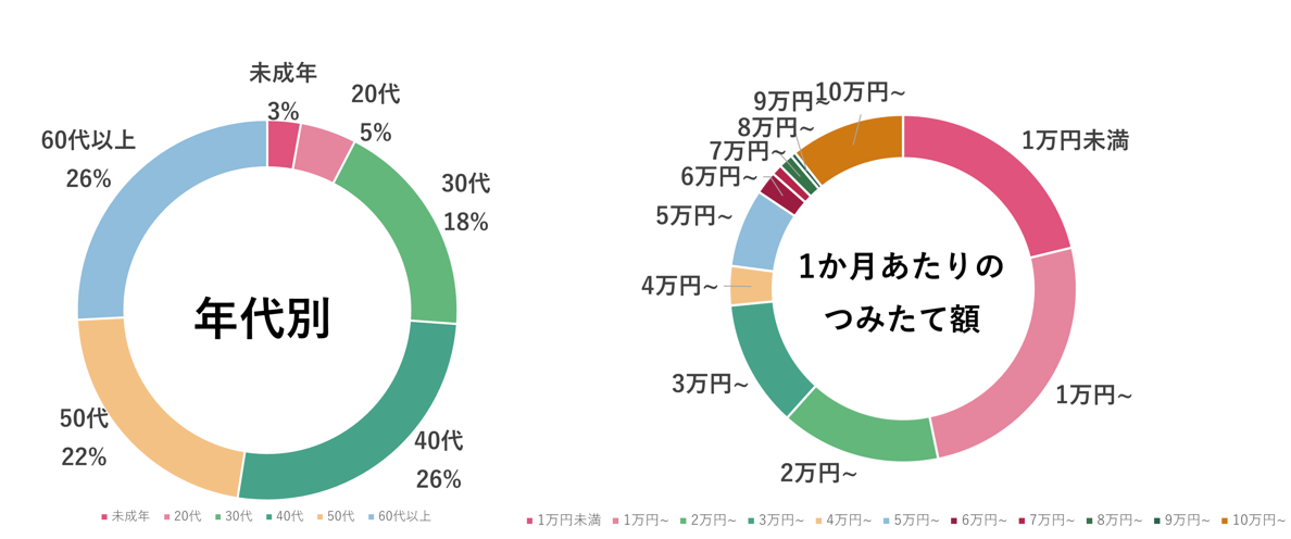 当社に直接口座を開設いただく直接販売では2008年にひふみ投信・2019年にひふみワールドが開始し、現在の基準価額はひふみ投信80,832円、ひふみワールド26,284円(10月15日時点)となります。直接販売のお客様は現在約6万人、全体の50%強のお客様が資産形成層の40代以下です。また約70%のお客様が1か月あたり1~3万円のつみたて投資を行なっています。
