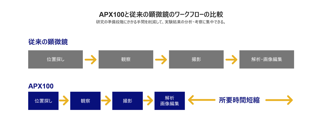 様々な産業分野でデジタル化が進む昨今、顕微鏡を使う研究者の方々からも、デジタル化によるワークフローの改善を求める声がありました。例えば研究者からは、「観察前に行うサンプル探しやピント調整、研究の準備段階にかかる手間を削減して、実験結果の分析・考察に集中したい」というニーズがありました。このようなニーズに応えるべく、簡単に使えて、研究の効率化に貢献できる、デジタルイメージングシステム「APEXVIEW APX100」を開発しました。