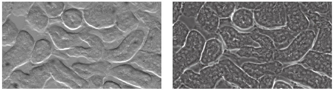 グラディエントコントラスト観察の方が、位相差観察に比べて組織の輪郭を立体的に観察できている。