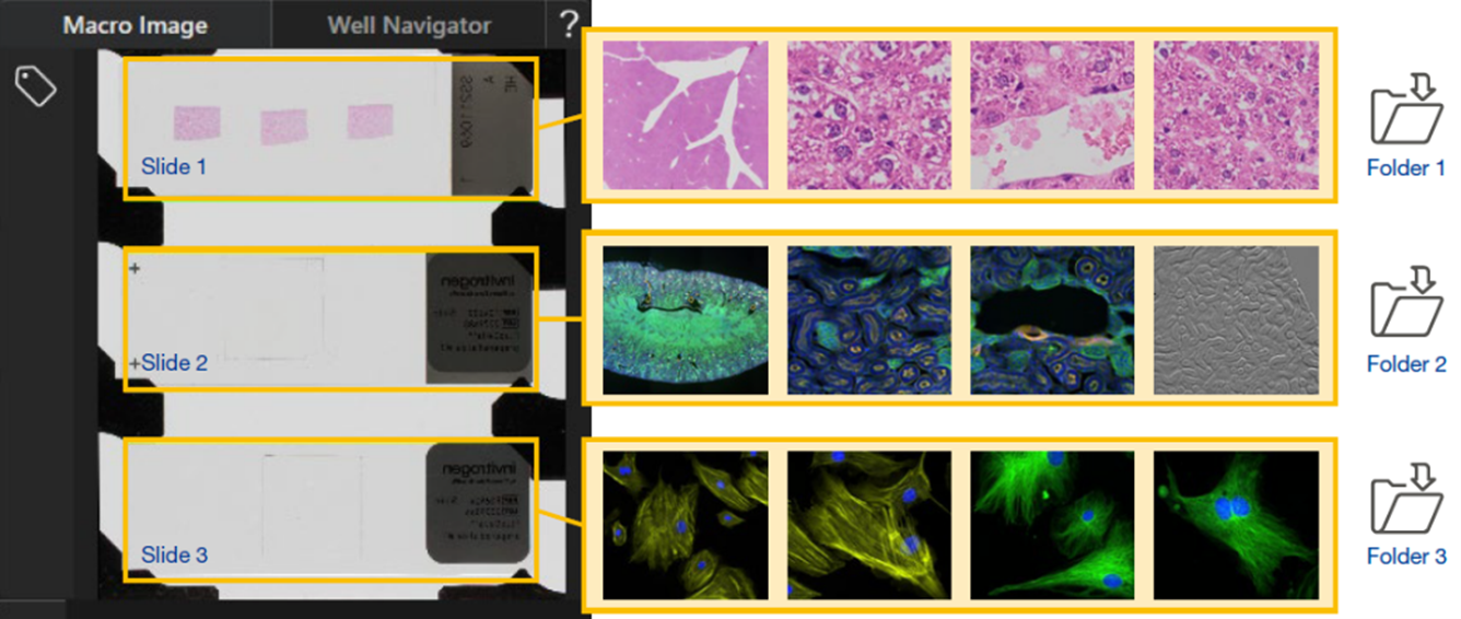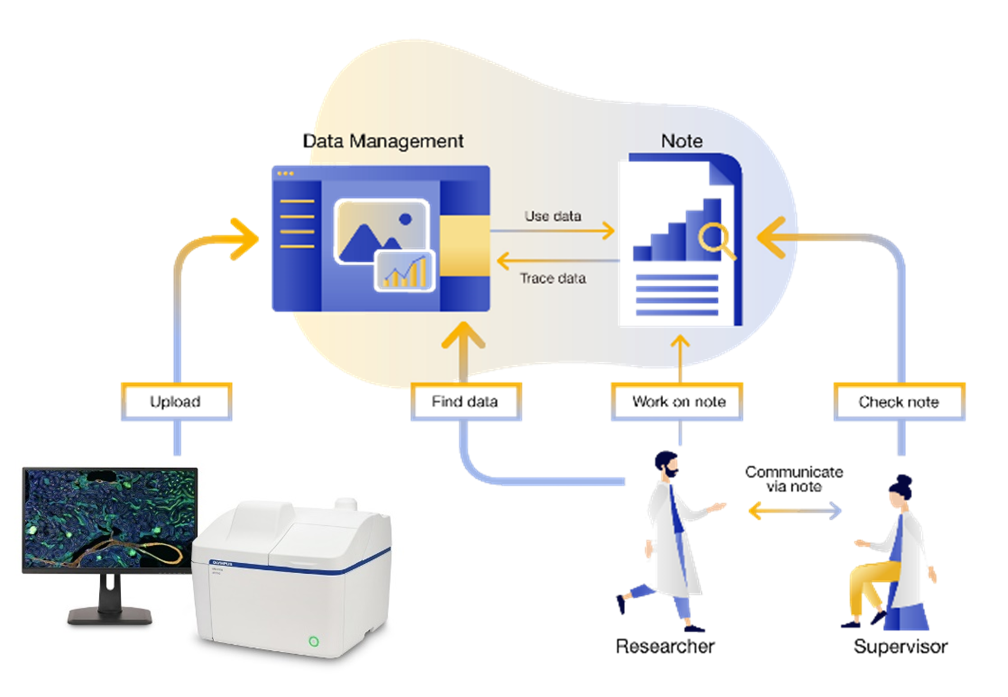 本製品が撮影したデータは、ソフトウェアが判別し整理を行い、サンプルごとに自動で生成されるフォルダへ保存されます。また、本製品はエビデントが提供するクラウドサービスOLSCと連携ができるため、研究に関するデータを一元管理することが可能です。過去の実験データの参照や、研究者間での共有をスムーズに行うことで、正確で効率的なデータ管理を実現することができます。