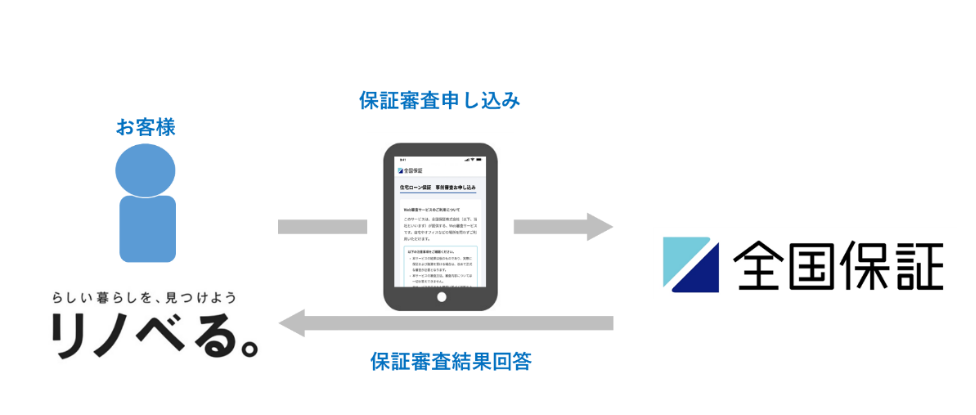 リノベるのお客様が「全国保証Web審査サービス」にアクセスし必要な情報を入力完了すると、申込データがAPIにより全国保証のシステムに取り込まれます。同社はそのデータを基に住宅ローン保証審査を行い、審査結果の回答を行います。