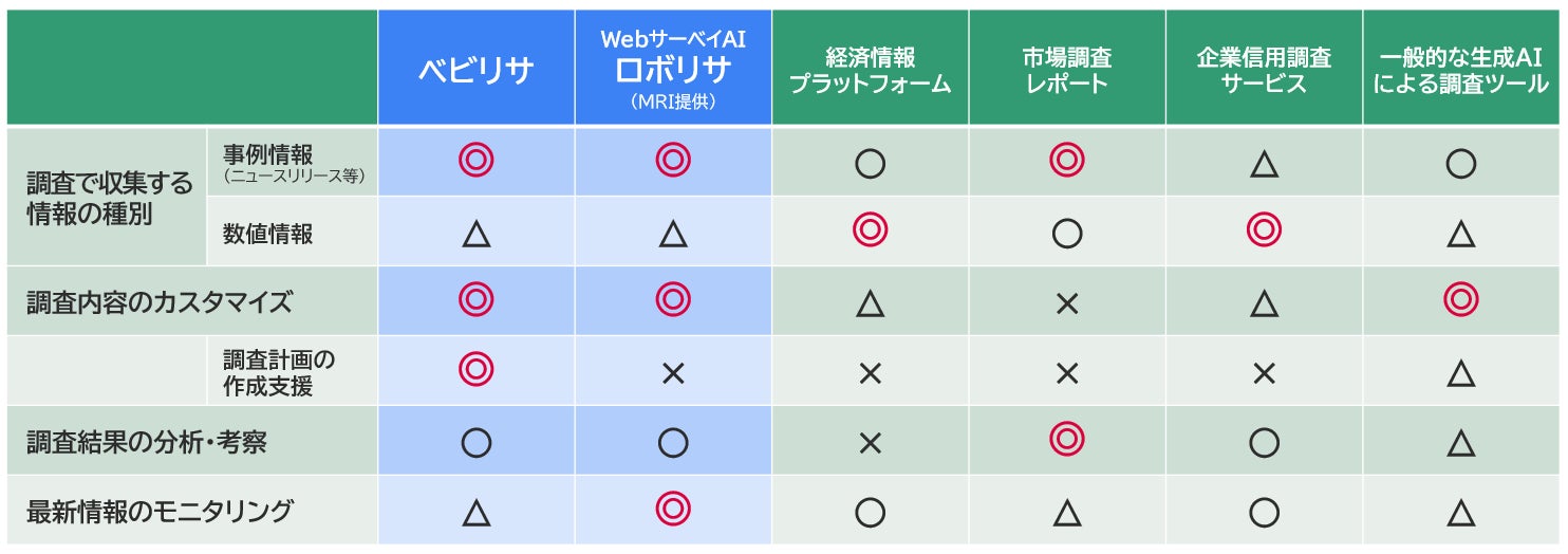 類似の製品・サービスと比較すると、ベビリサは特に「事例調査」「調査内容のカスタマイズ」「調査計画の作成支援」「レポート自動生成」に強みを持つツールです。すでにMRIが提供しているWebサーベイAI「ロボリサ」はテーマを決めて定点的に情報収集・分析・報告するためのツールであるのに対し、ベビリサは調べたいテーマが発生した時に素早く市場・技術などの概況をつかむためのツールです。