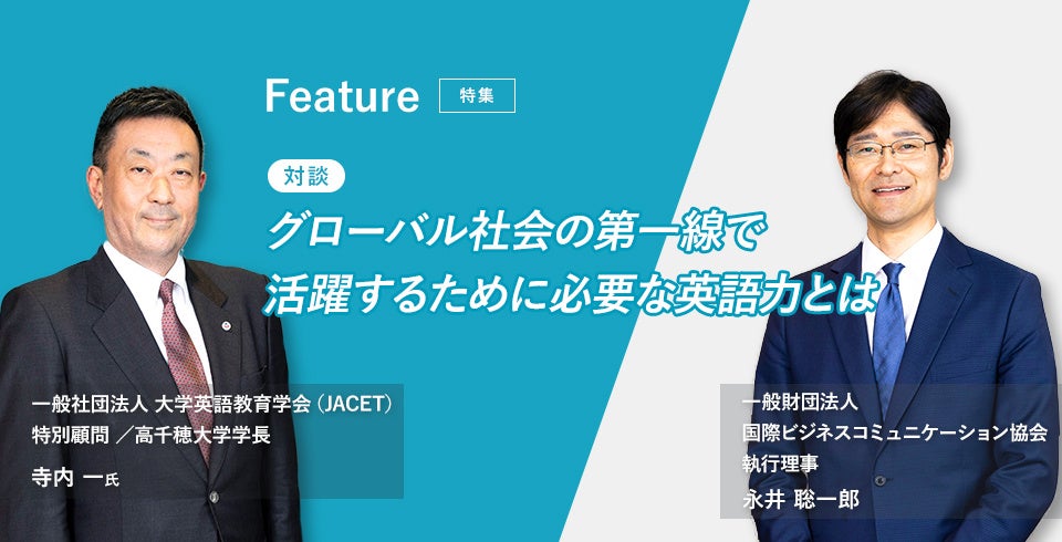 特集では、本調査研究を統括するJACET特別顧問/高千穂大学学長の寺内一氏と、IIBC執行理事の永井聡一郎が対談。調査結果から導きだされた、グローバル社会の第一線で活躍するために必要な英語力や、習得のためのポイントなどについて語り合いました。ぜひご覧ください。
