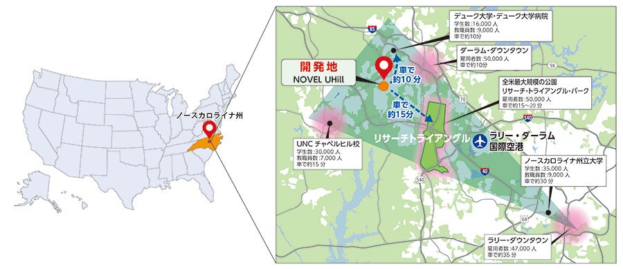 本物件は「リサーチトライアングル」と呼ばれるデューク大学、ノースカロライナ州立大学、ノースカロライナ大学チャペルヒル校の3校を結ぶエリアに位置し、その中心部にはITやライフサイエンス分野のグローバルカンパニーが300社以上集積しています。ダーラムのダウンタウンエリア、全米屈指の研究機関であるデューク大学、デューク大学病院までいずれも車で約10分。全米最大規模の先端産業集積地であるリサーチ・トライアングル・パークやノースカロライナ大学チャペルヒル校、チャペルヒルのダウンタウンエリアまで車で約15分と、同エリアを代表する大学や雇用地までアクセスが良いエリアに位置します。周辺には徒歩圏内の大型商業区域University Hill(ユニバーシティヒル)を含む複数のショッピングセンターや飲食店が所在し、生活利便性も高い立地が特徴です。ノースカロライナ州は段階的に法人税率を引き下げており、今後さらに近隣の州からの企業進出と人財流入による人口増