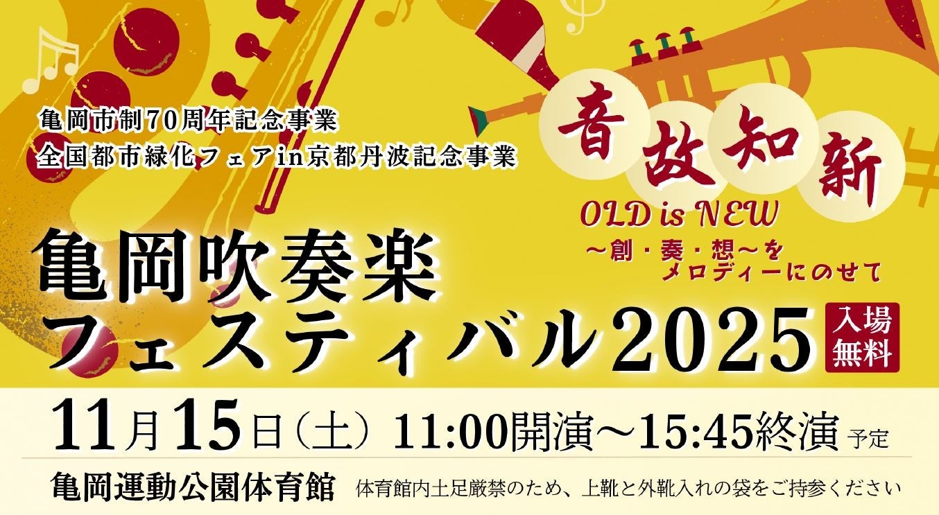 京都府亀岡市(市長:桂川孝裕)は、市制70周年を記念し、2025年11月に市内各所で入場無料の大規模音楽イベントを各実行委員会と共催で連続開催します。11月2日(日)にはJR亀岡駅周辺で「亀岡ジャズフェスティバル2025」を、11月15日(土)には亀岡運動公園体育館で初開催となる「亀岡吹奏楽フェスティバル2025」を実施し、音楽を通じてまちの賑わいを創出します。