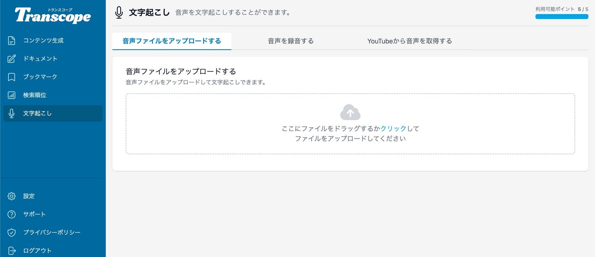 トランスコープの[文字起こし]メニューをクリックして文字起こし画面にアクセスしてください。