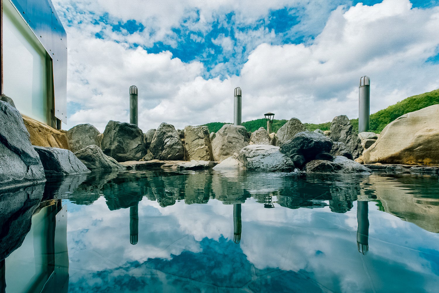 ③薪の香る滑らかな肌触りの天然温泉。露天風呂・ジャグジー・サウナを心ゆくまで