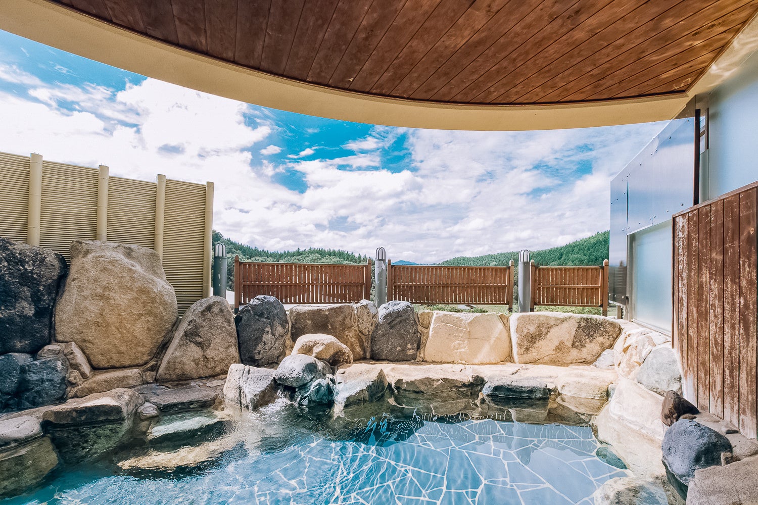 高原リゾートホテル「芸北オークガーデン」の敷地内に位置する「温泉グランピング WOOODS芸北」は、ホテルの天然温泉の露天風呂を利用することができます。