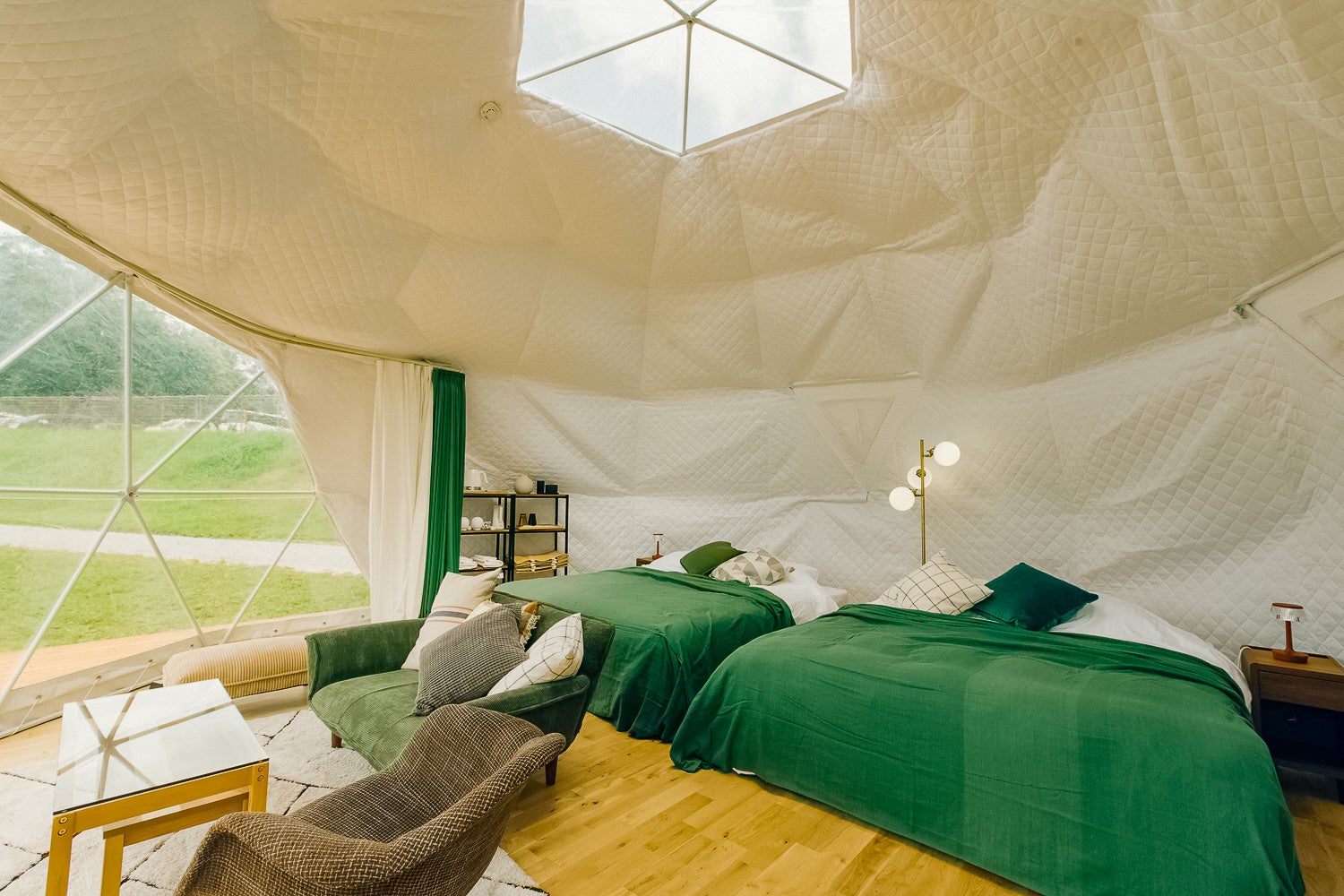 ②こだわりのインテリアを配置した大空間。1棟貸切仕様。直径6Mの大型ドームテント