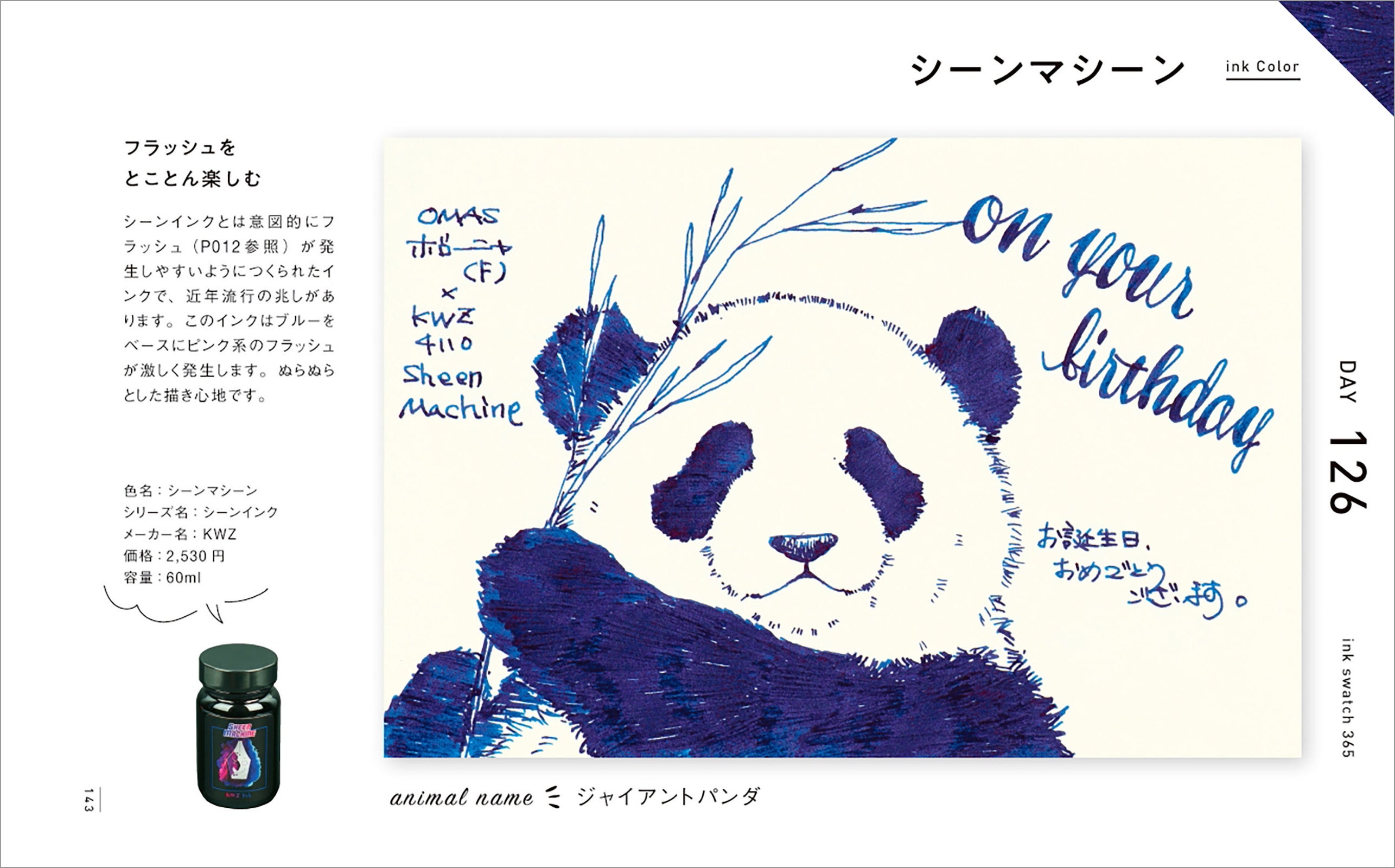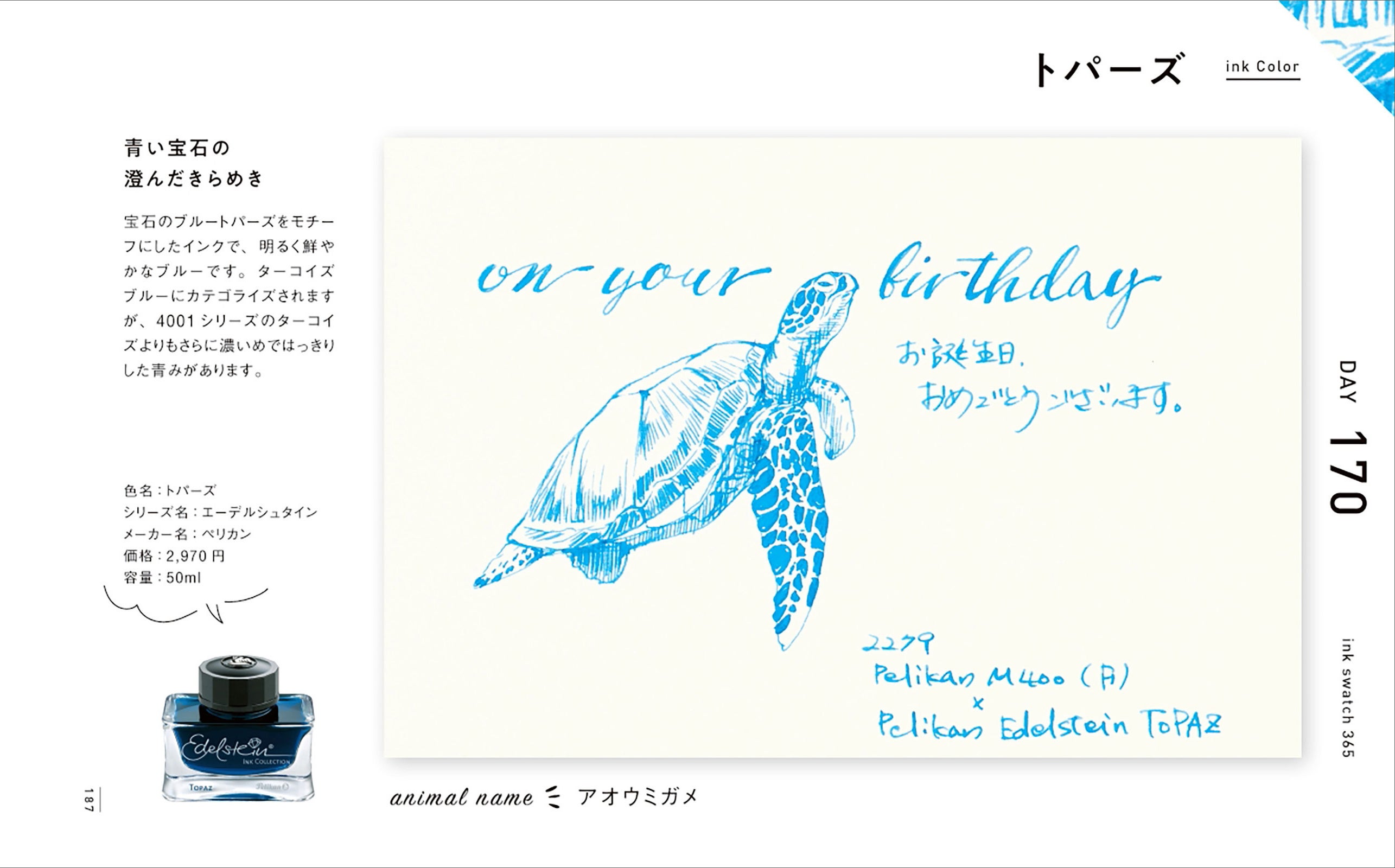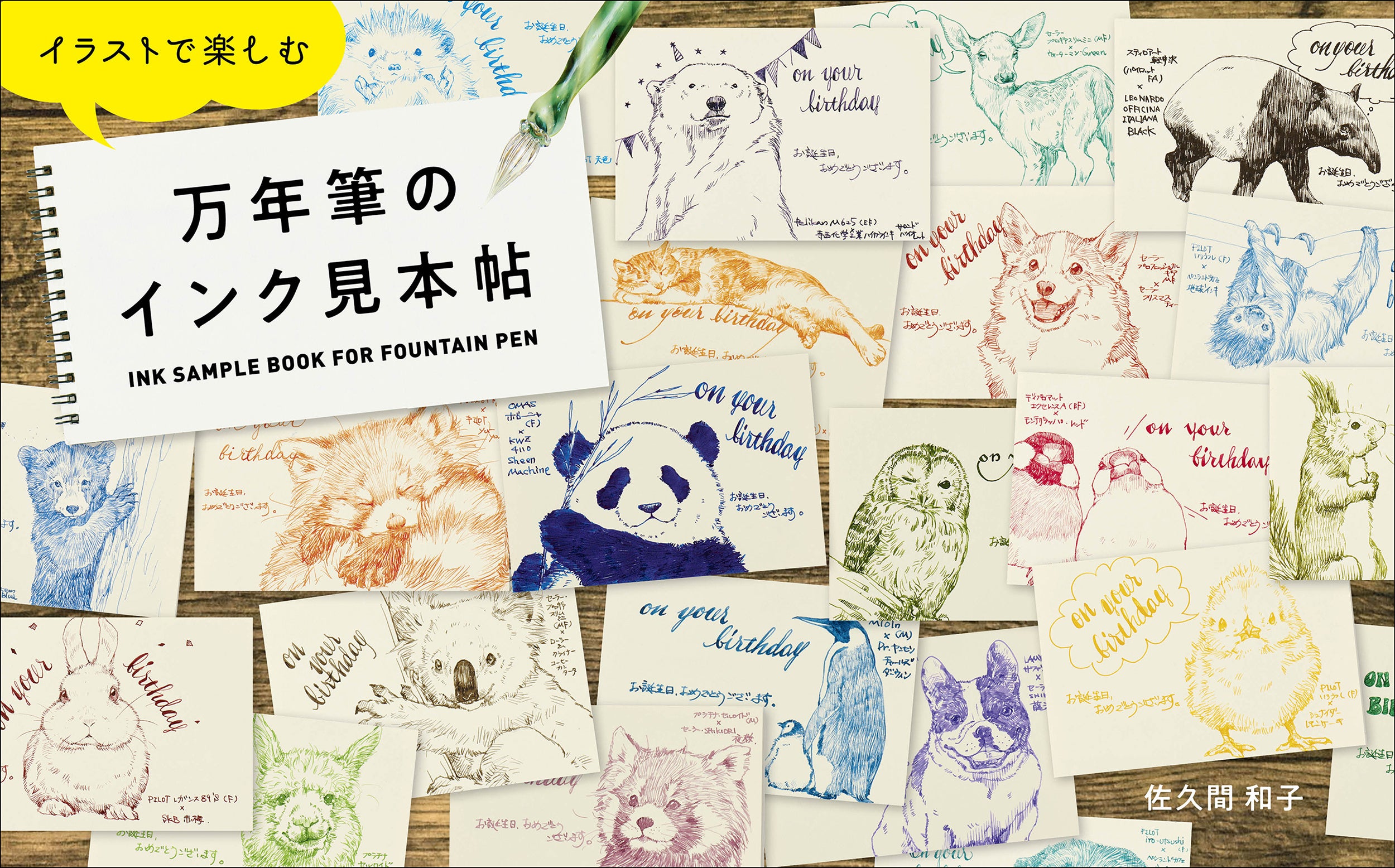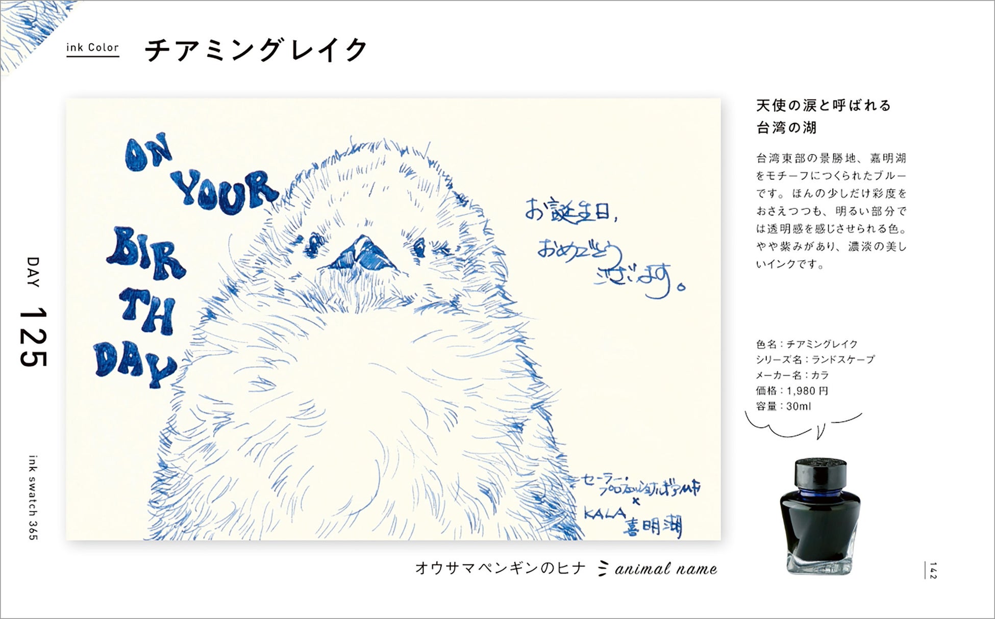 インクの特性と万年筆の特徴を活かし、強弱をつけながら陰影や動物の表情を繊細に表現したイラスト365点は、その圧倒的なボリュームと1点1点のクオリティの高さで、鑑賞するだけでも十分に楽しめます。またそれぞれのイラストに「お誕生日おめでとうございます」「On your birthday」の文字も添えてありますので、自分で万年筆を使ったときにどういうふうに文字やイラストが描けるか、とても具体的な事例として参考になります。