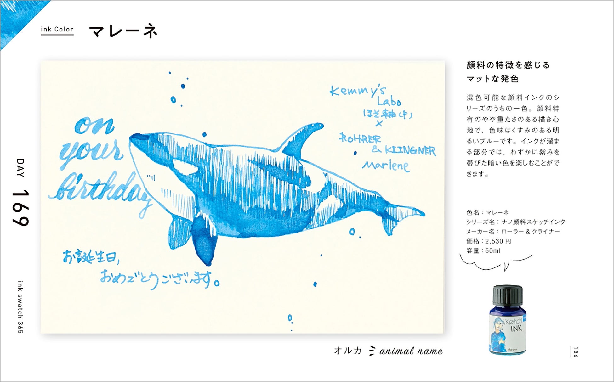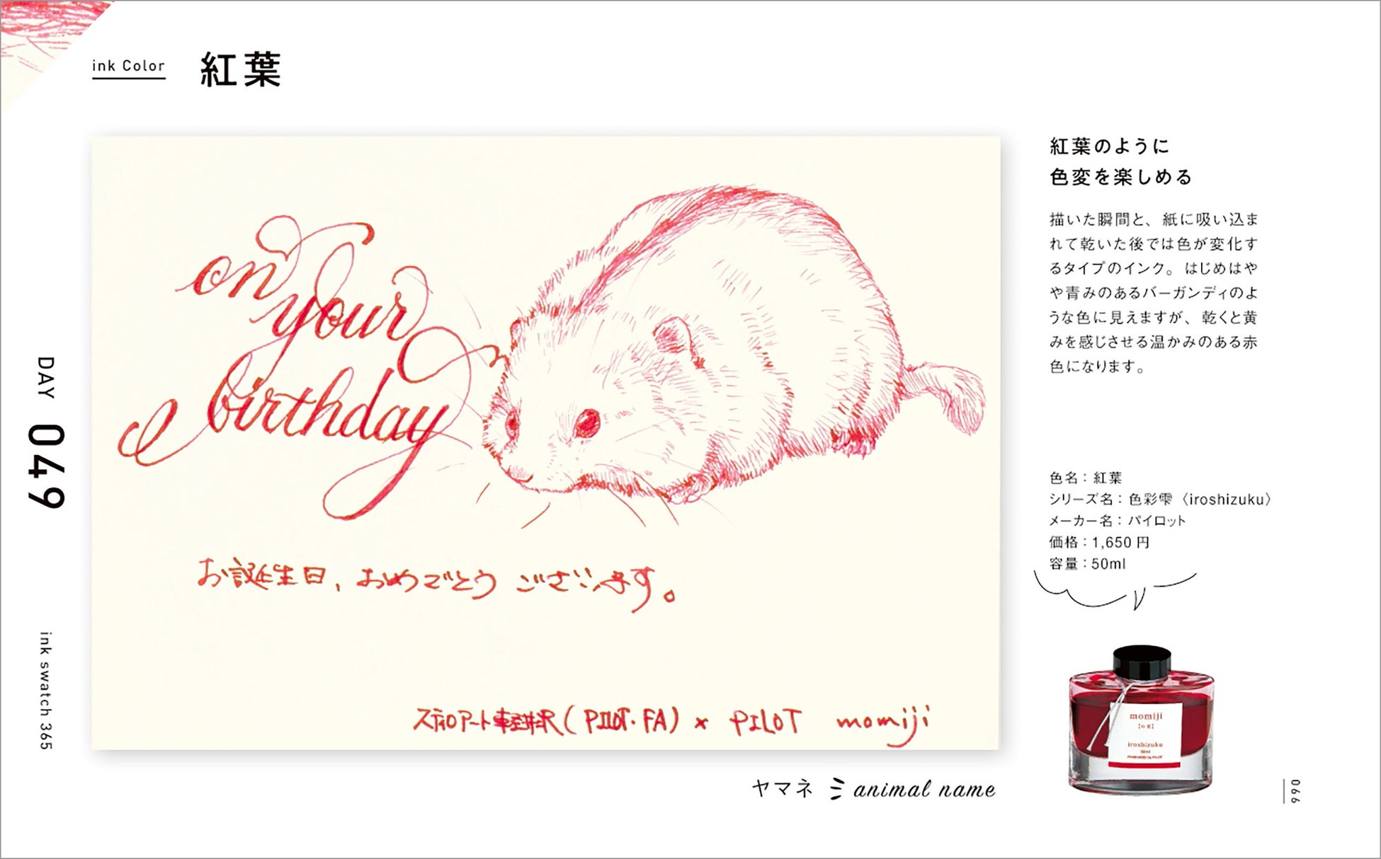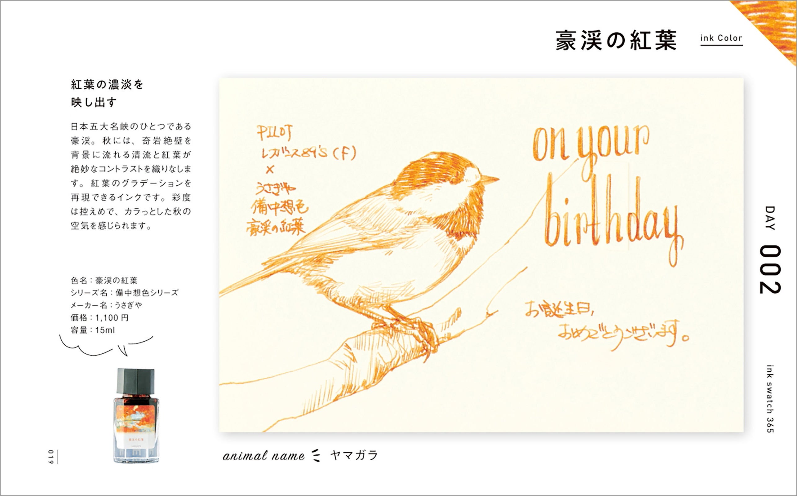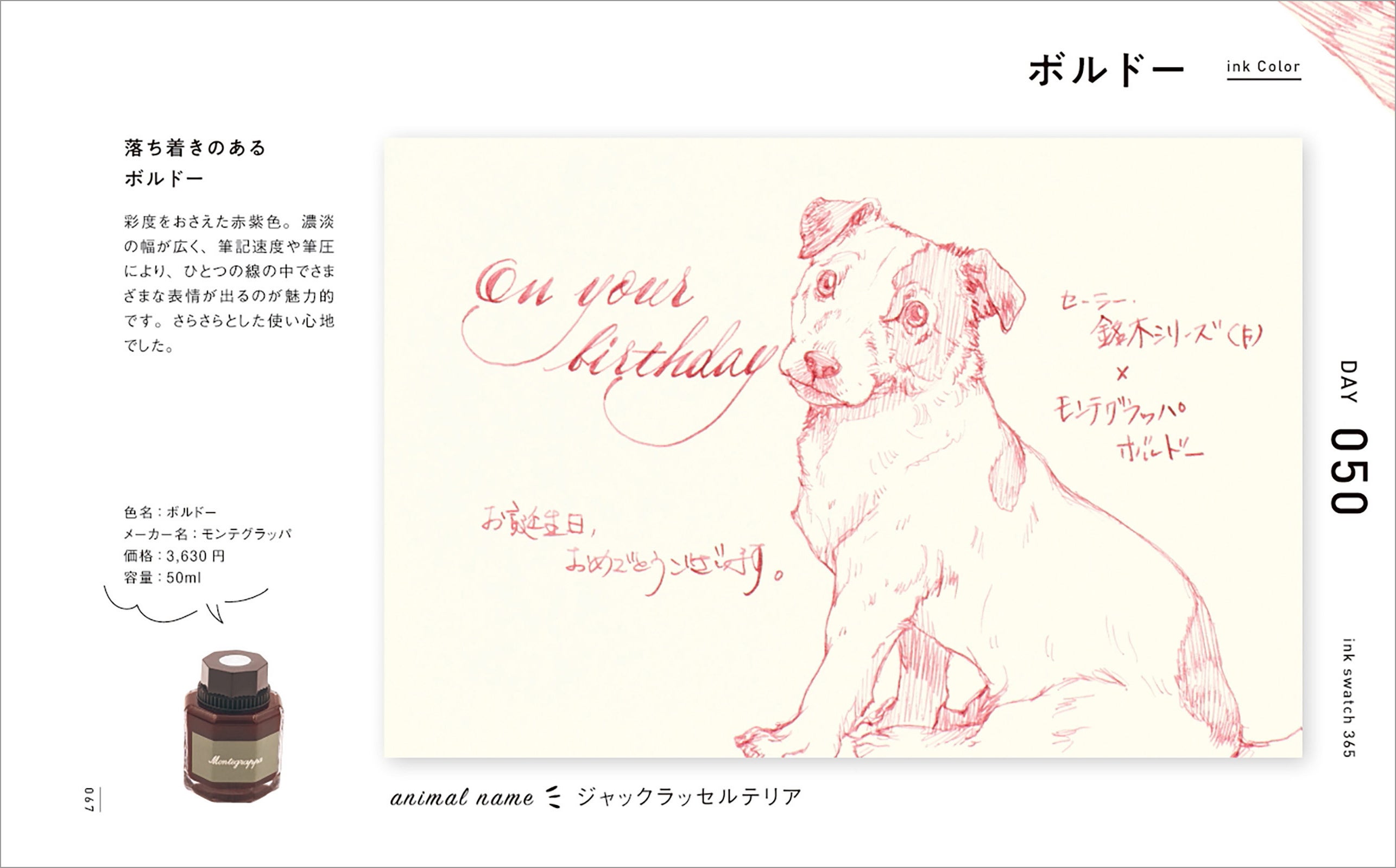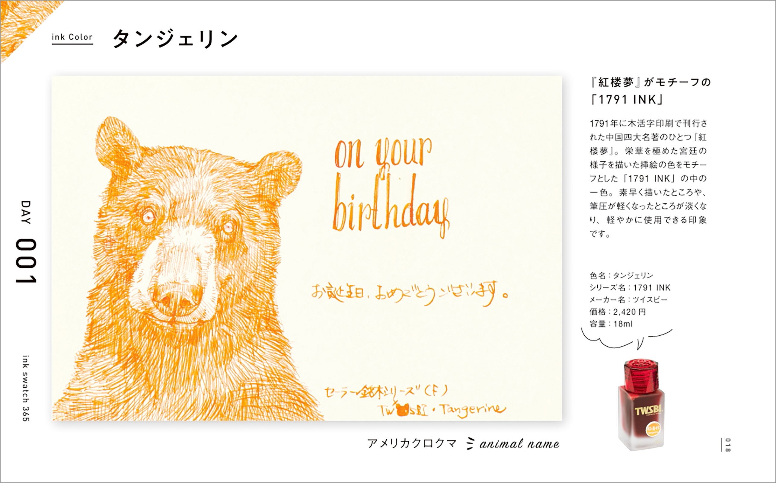 インクの特性と万年筆の特徴を活かし、強弱をつけながら陰影や動物の表情を繊細に表現したイラスト365点は、その圧倒的なボリュームと1点1点のクオリティの高さで、鑑賞するだけでも十分に楽しめます。またそれぞれのイラストに「お誕生日おめでとうございます」「On your birthday」の文字も添えてありますので、自分で万年筆を使ったときにどういうふうに文字やイラストが描けるか、とても具体的な事例として参考になります。