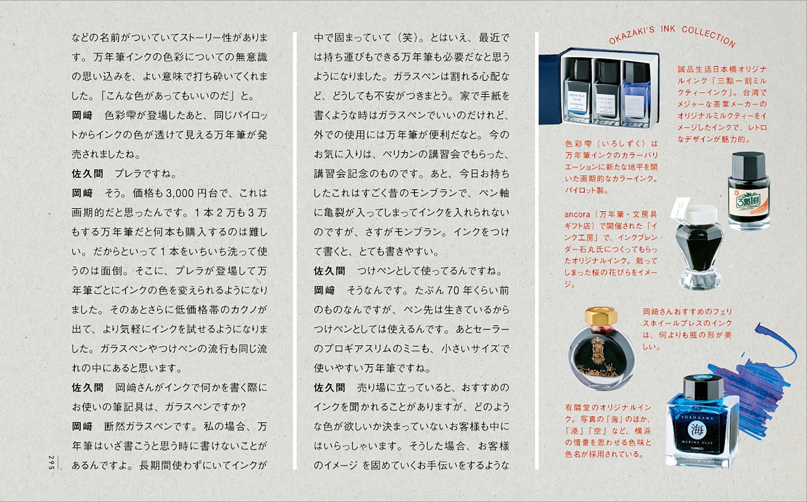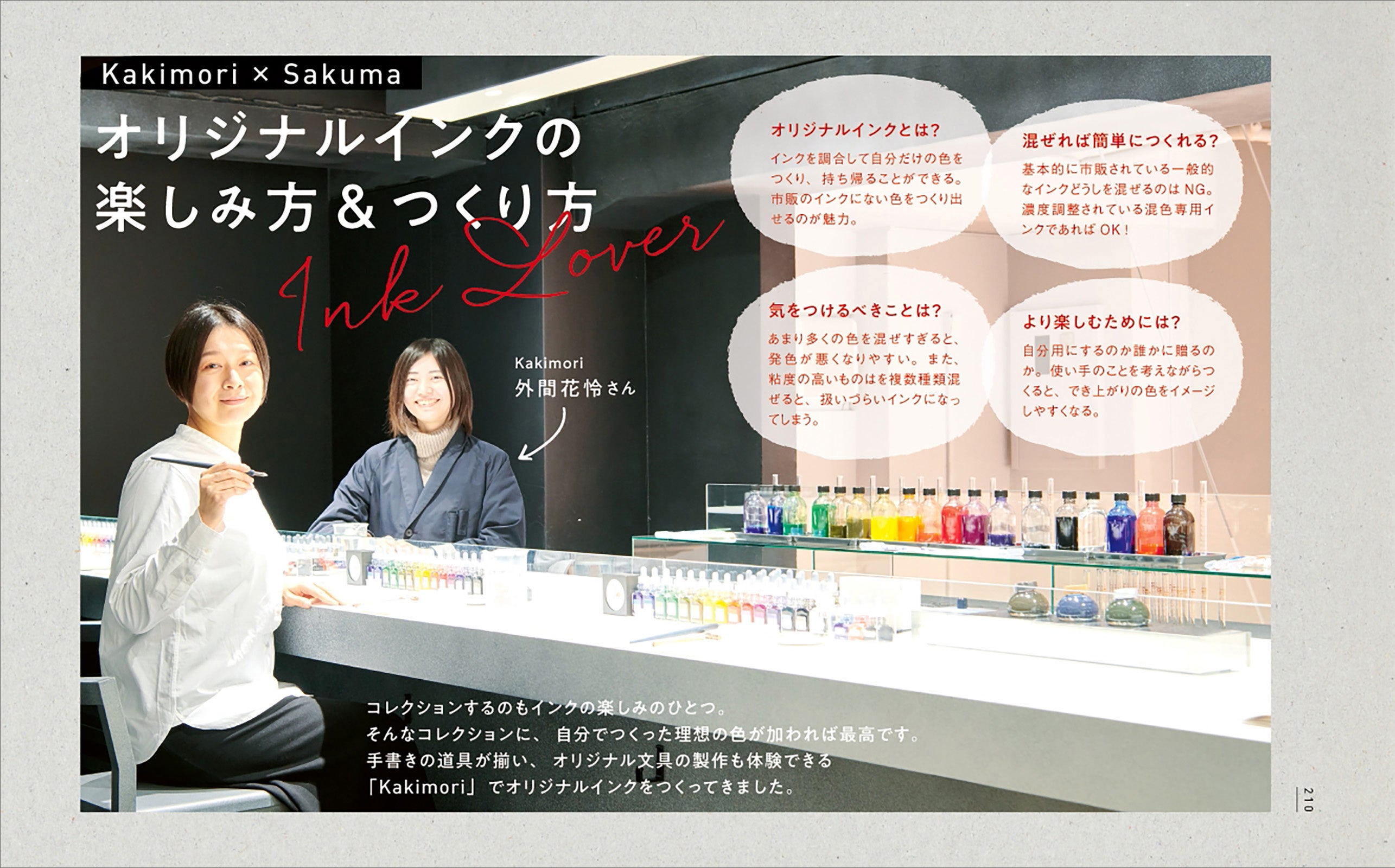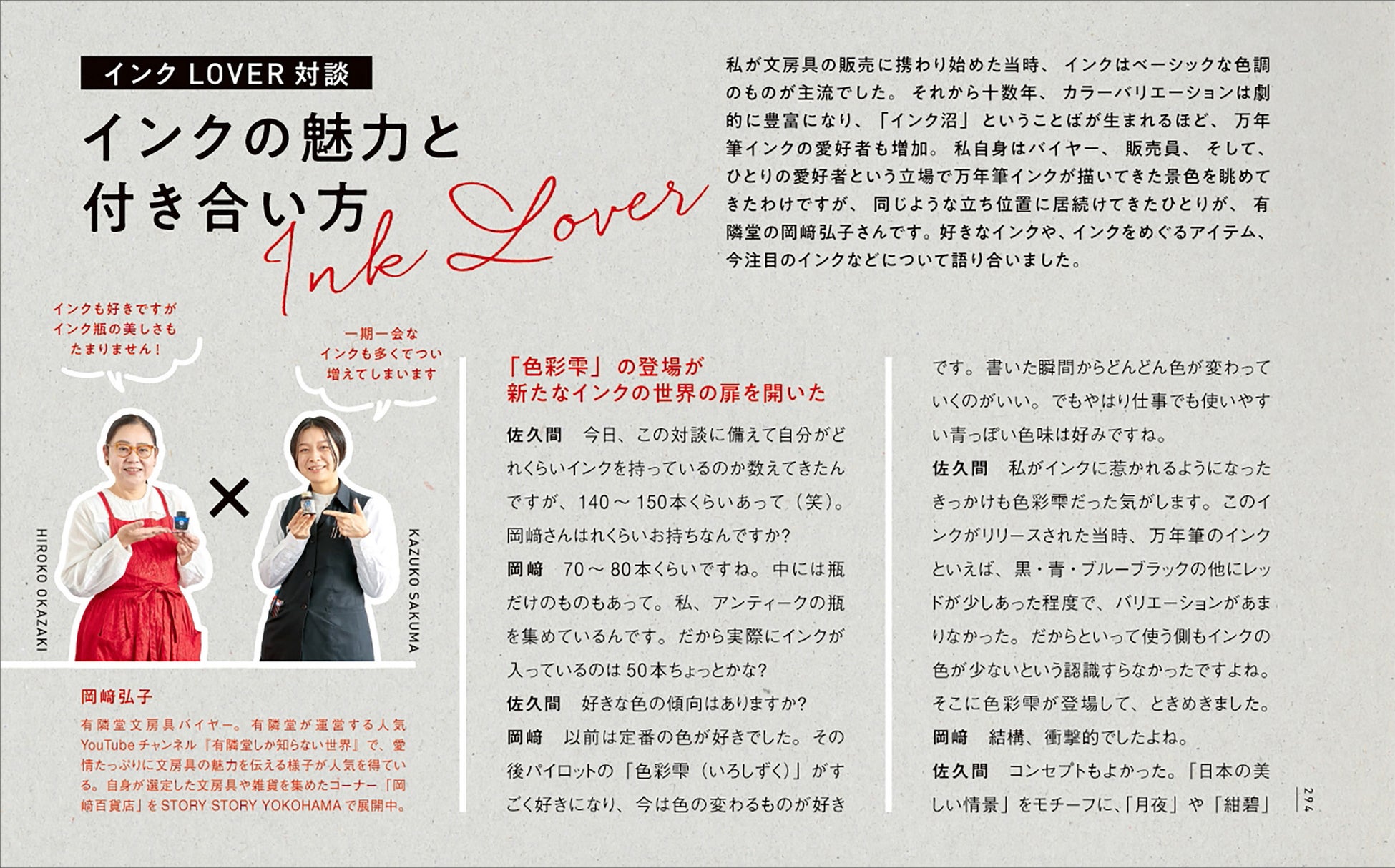 他にも有隣堂の文具バイヤー・岡崎弘子氏との対談やオリジナルインクの作り方 & 楽しみ方も掲載しています。文房具好きや万年筆好きな人はもちろん、これから万年筆を購入しようと考えている人もぜひ手に取ってもらいたい一冊です。