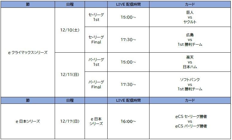 セ・リーグのeCS(10日)は、ファーストステージで巨人(2位)とヤクルト(3位)の勝者が、ファイナルステージでリーグ2連覇を果たした広島と、パ・リーグ(11日)はファイナルステージで楽天イーグルス(2位)と北海道日本ハム(3位)の勝者が、ファイナルステージでリーグ覇者のソフトバンクとe日本シリーズ進出をかけて戦います。